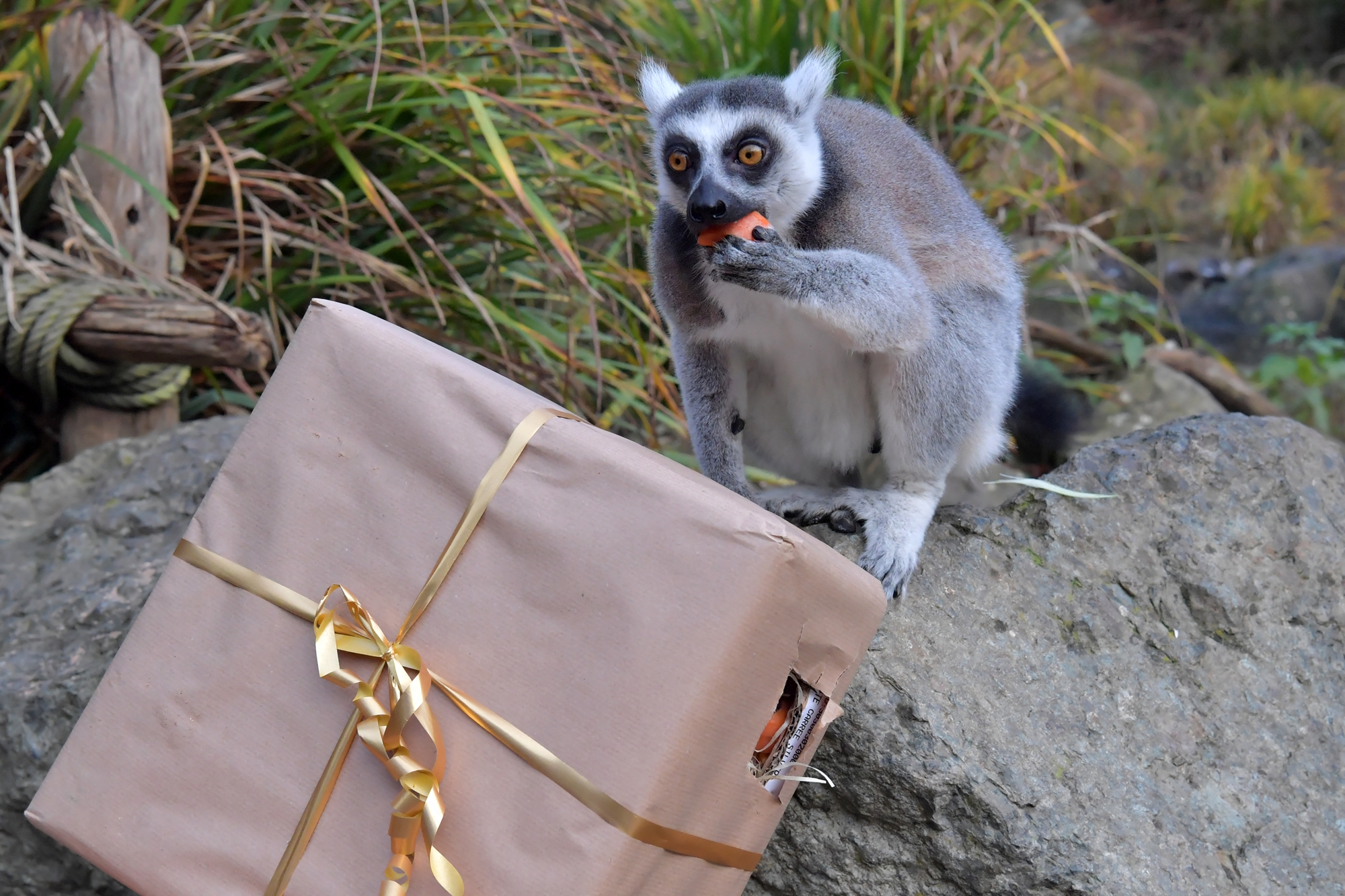 A ring-tailed lemur eats from a box of food given by their keepers as a Christmas present, at the La Fleche Zoo, western France, on December 23, 2024. (Photo by Jean-Francois Monier/AFP Photo)