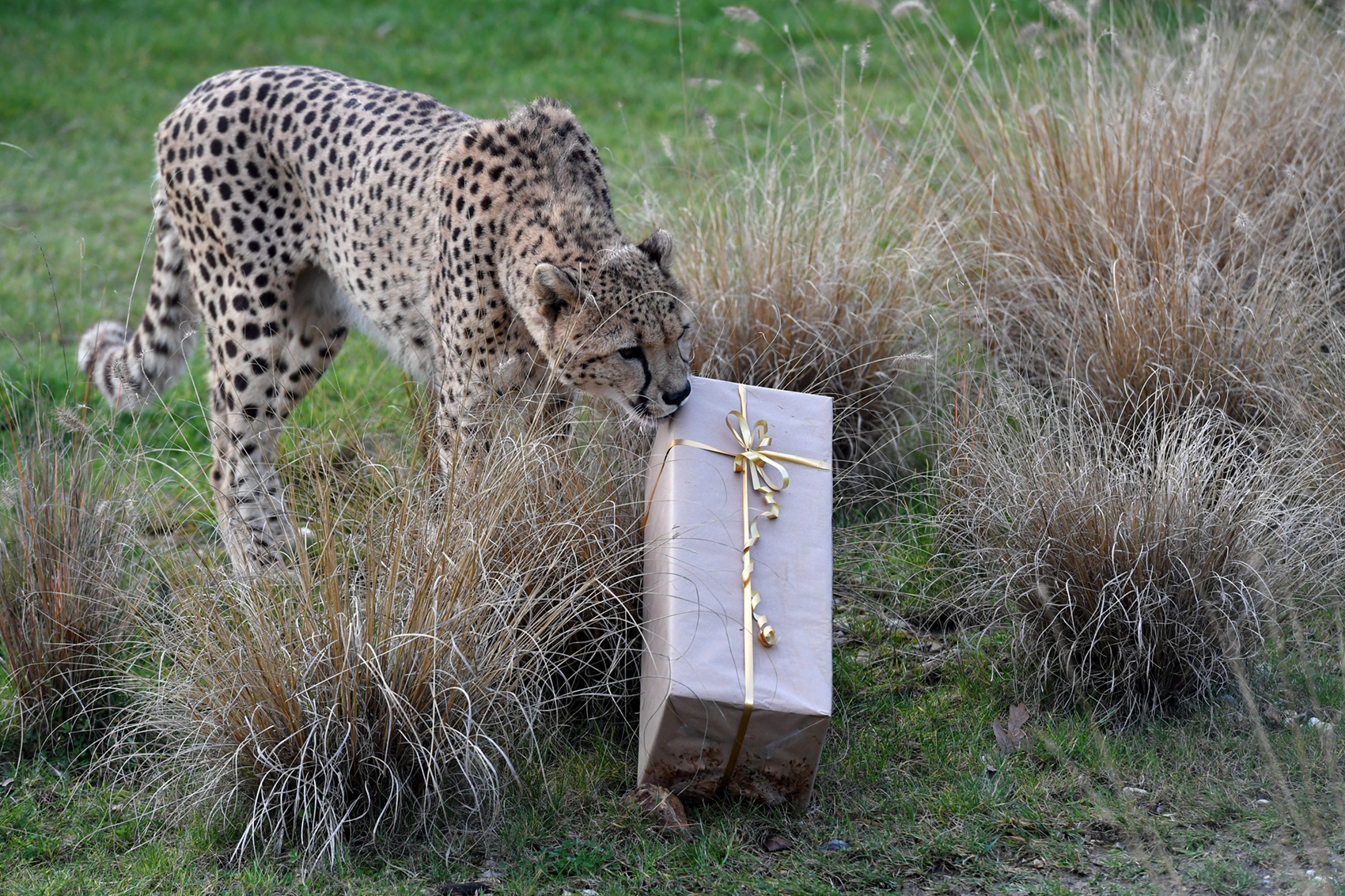 A cheetah discovers a box of food given by their keepers as a Christmas present, at the La Fleche Zoo, western France, on December 23, 2024. (Photo by Jean-Francois Monier/AFP Photo)