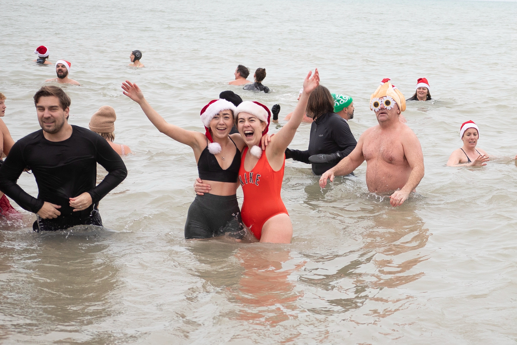 People take part in the annual Brighton Christmas Day Dip on December 25, 2024 in Brighton, England. The Brighton Christmas Day dip is widely accepted as the oldest established Christmas sea swim. People have been turning up on Brighton's beach on Christmas Day to enter the waters since 1860. The event is not organised by any particular group but still manages to bring in hundreds of spectators and participants every year. (Photo by Charlotte Coney/Getty Images)