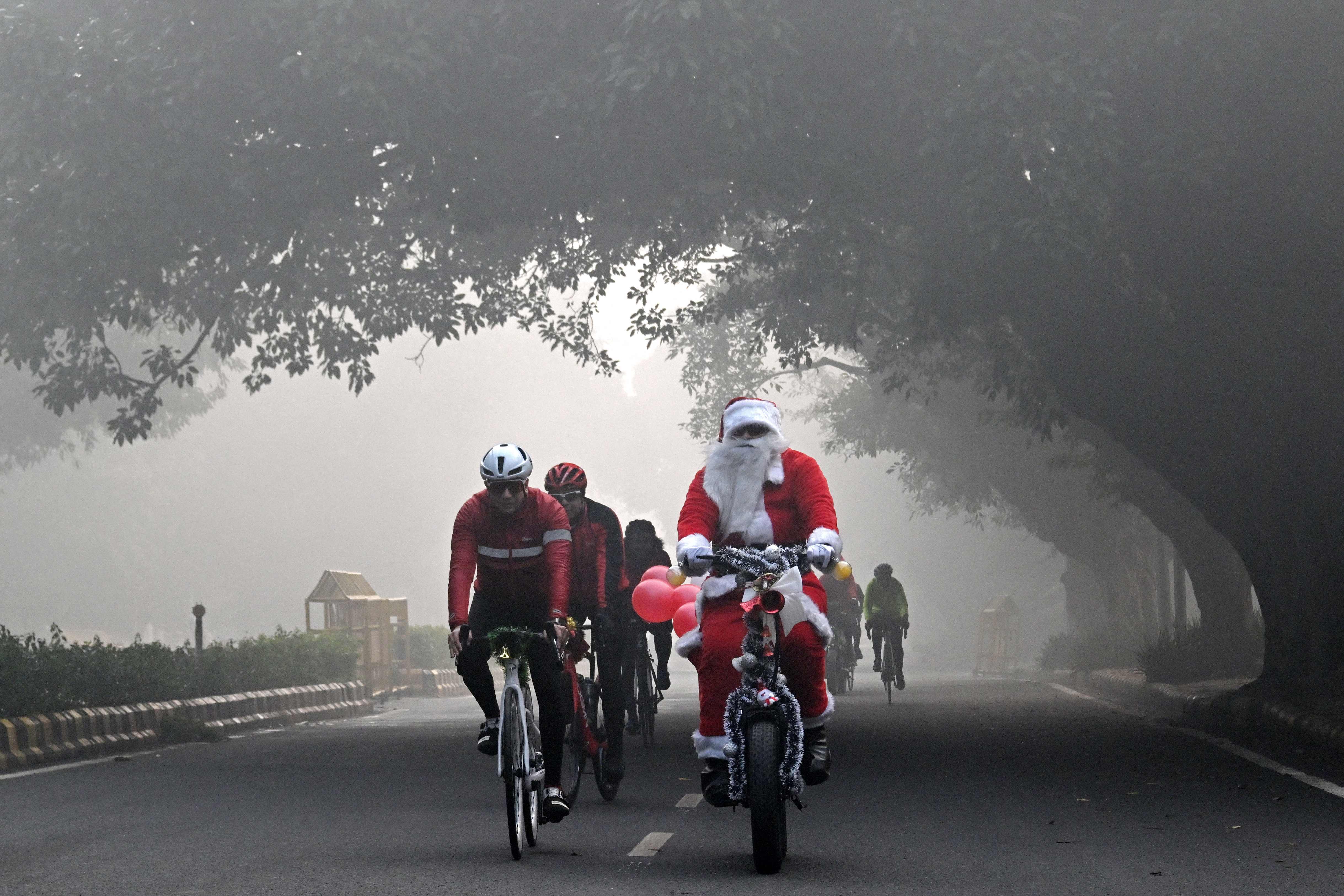 A cyclist dressed as Santa Claus rides along a road, on Christmas in New Delhi on December 25, 2024. (Photo by Arun Sankar/AFP Photo)