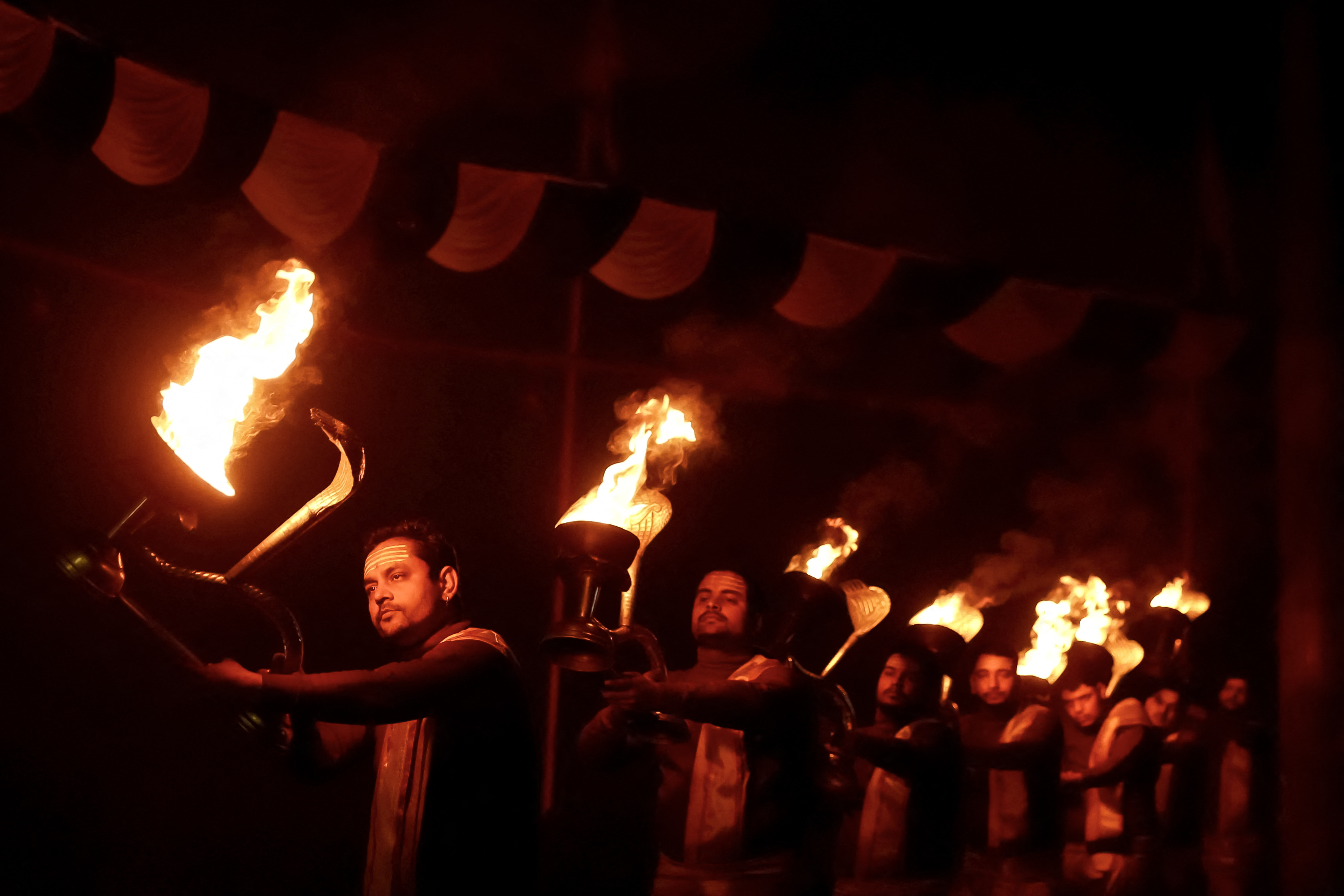 Hindu priests perform morning prayers on the banks of the Ganges river at Assi Ghat on a cold winter morning in Varanasi on December 27, 2024. (Photo by Niharika Kulkarni/AFP Photo)
