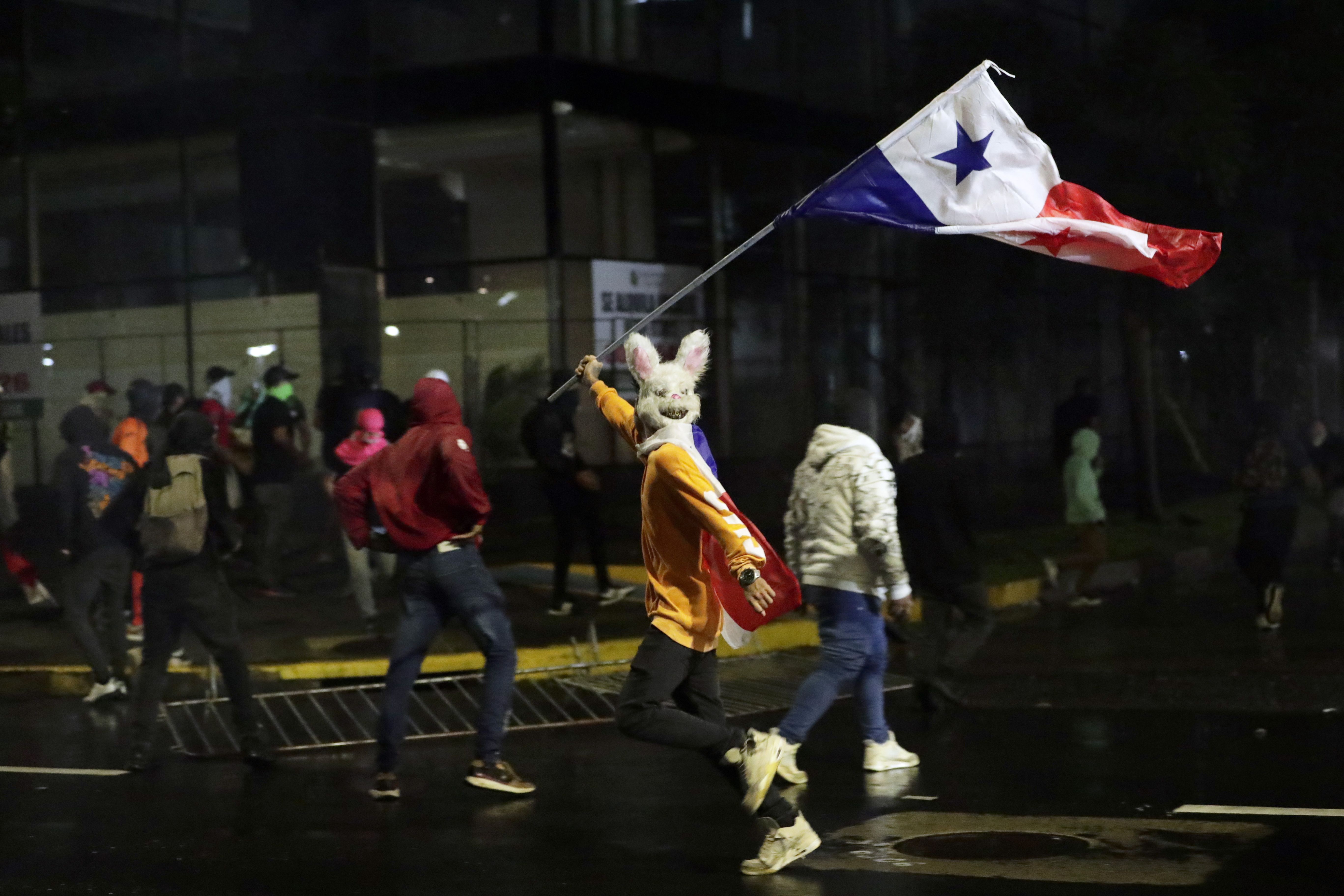 A protester runs amid clashes with police during a march against copper mining in Panama City, Panama, 28 October 2023. Protests continue in Panama after the renewal of a concession to Minera Panama, a subsidiary of Canadian First Quantum Minerals, which operates the largest open-pit copper mine in Central America. (Photo by Bienvenido Velasco/EPA)