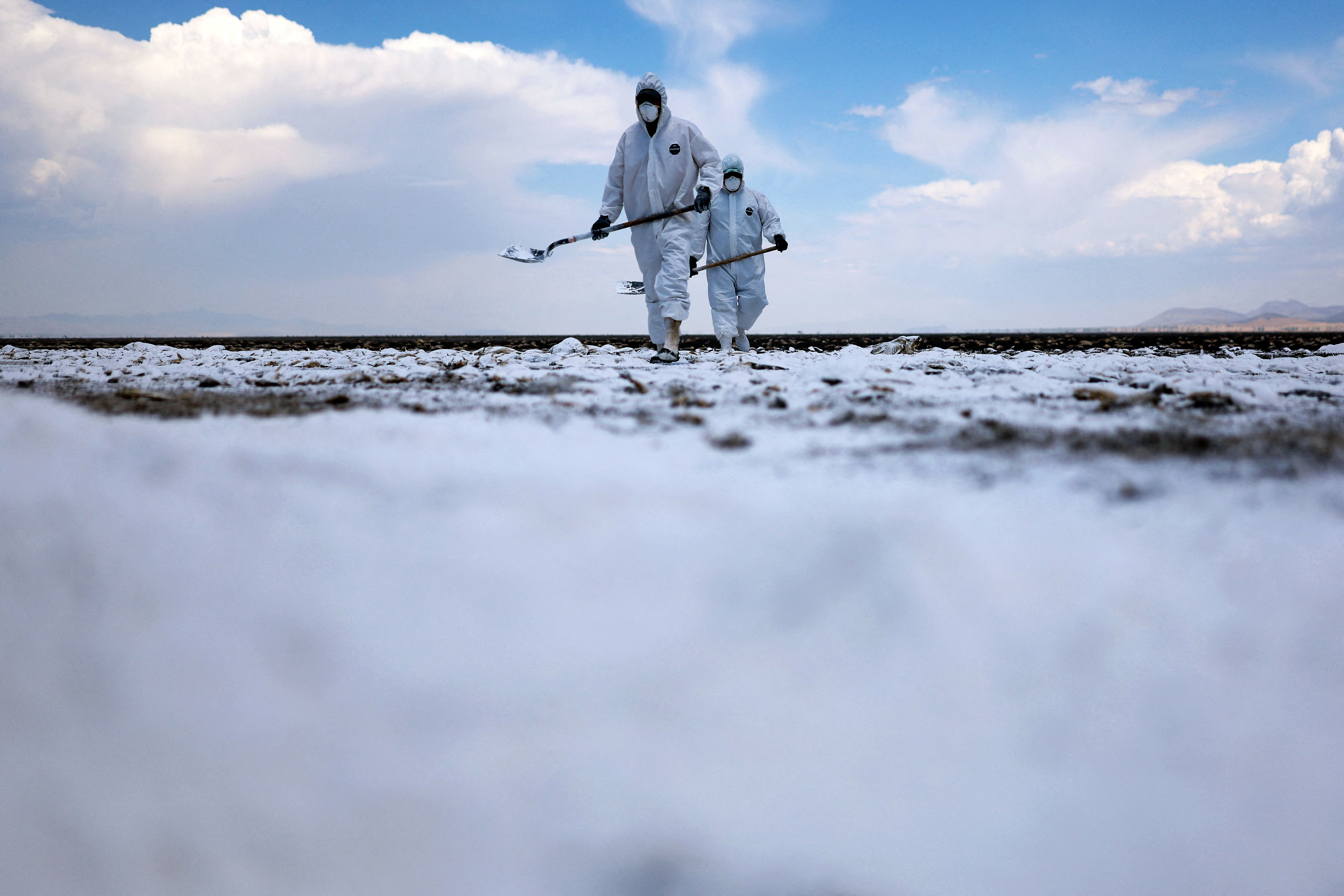 Municipal workers spread quicklime over dead fish to reduce the stench, at the dry bed of the Bustillos Lagoon in Anahuac, Chihuahua state, Mexico, on June 7, 2024. (Photo by Jose Luis Gonzalez/Reuters)