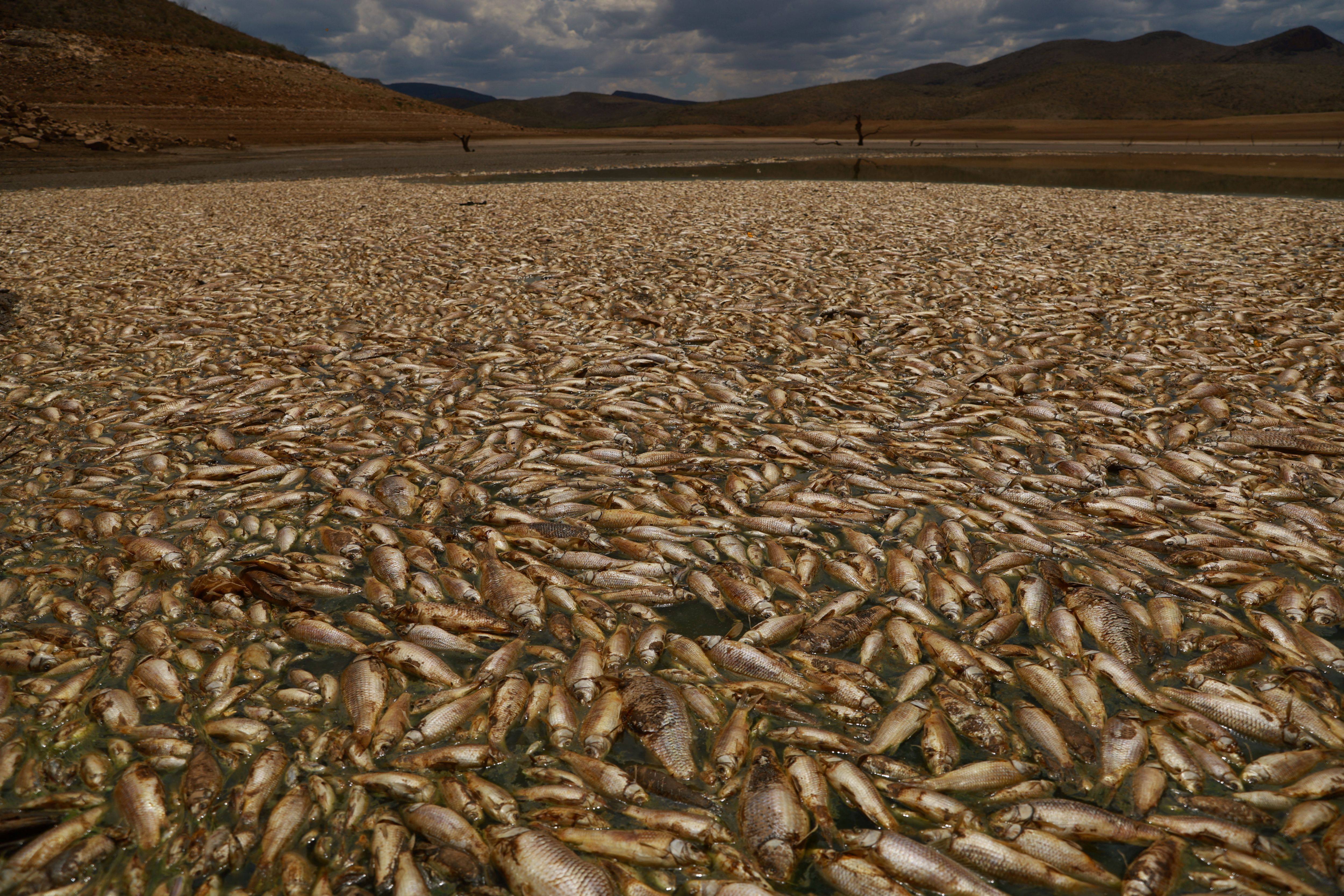 Thousands of dead fish lie on the dry bed of the Las Lajas dam, due to a severe drought, in Buenaventura, Chihuahua state, Mexico on August 23, 2024. (Photo by Jose Luis Gonzalez/Reuters)