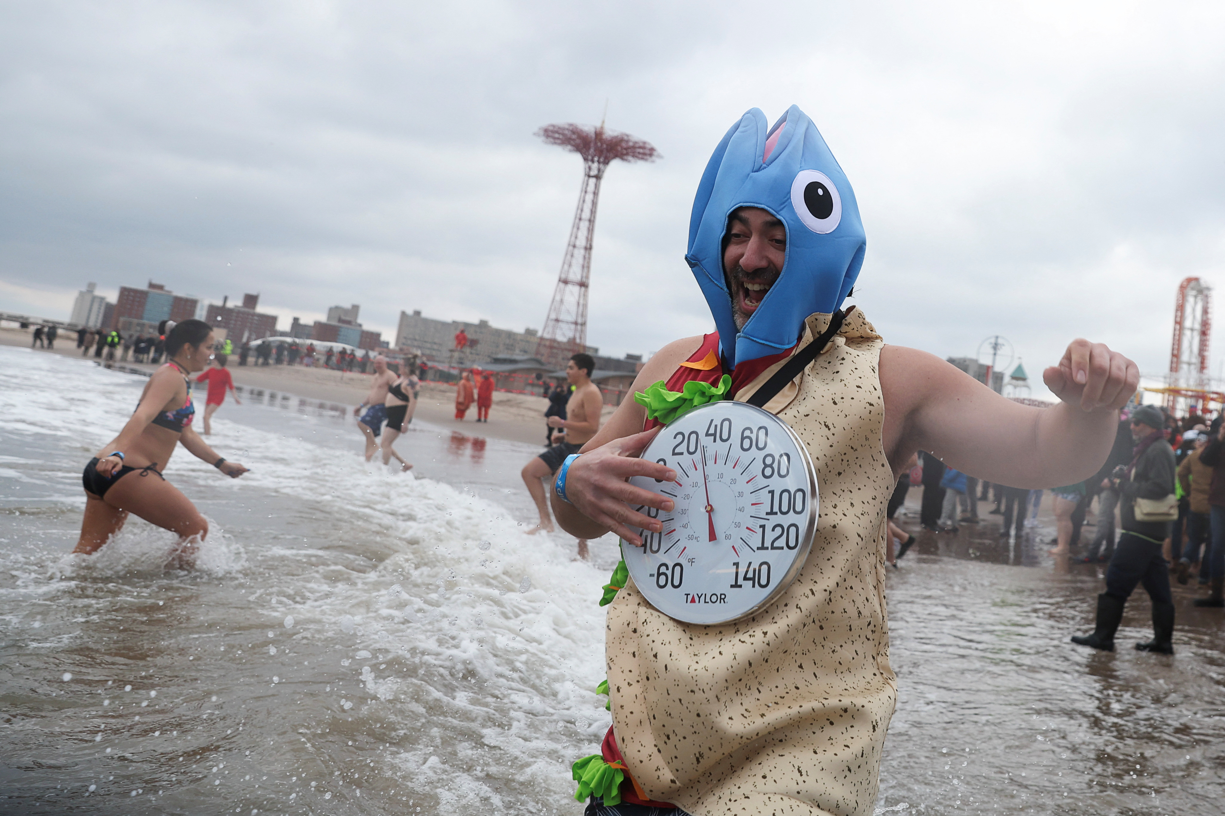 A costume wearing bather runs into the sea during the annual Polar Bear swim marking New Year’s Day, at Coney Island, in New York City, U.S. January 1, 2025. (Photo by Heather Khalifa/Reuters)