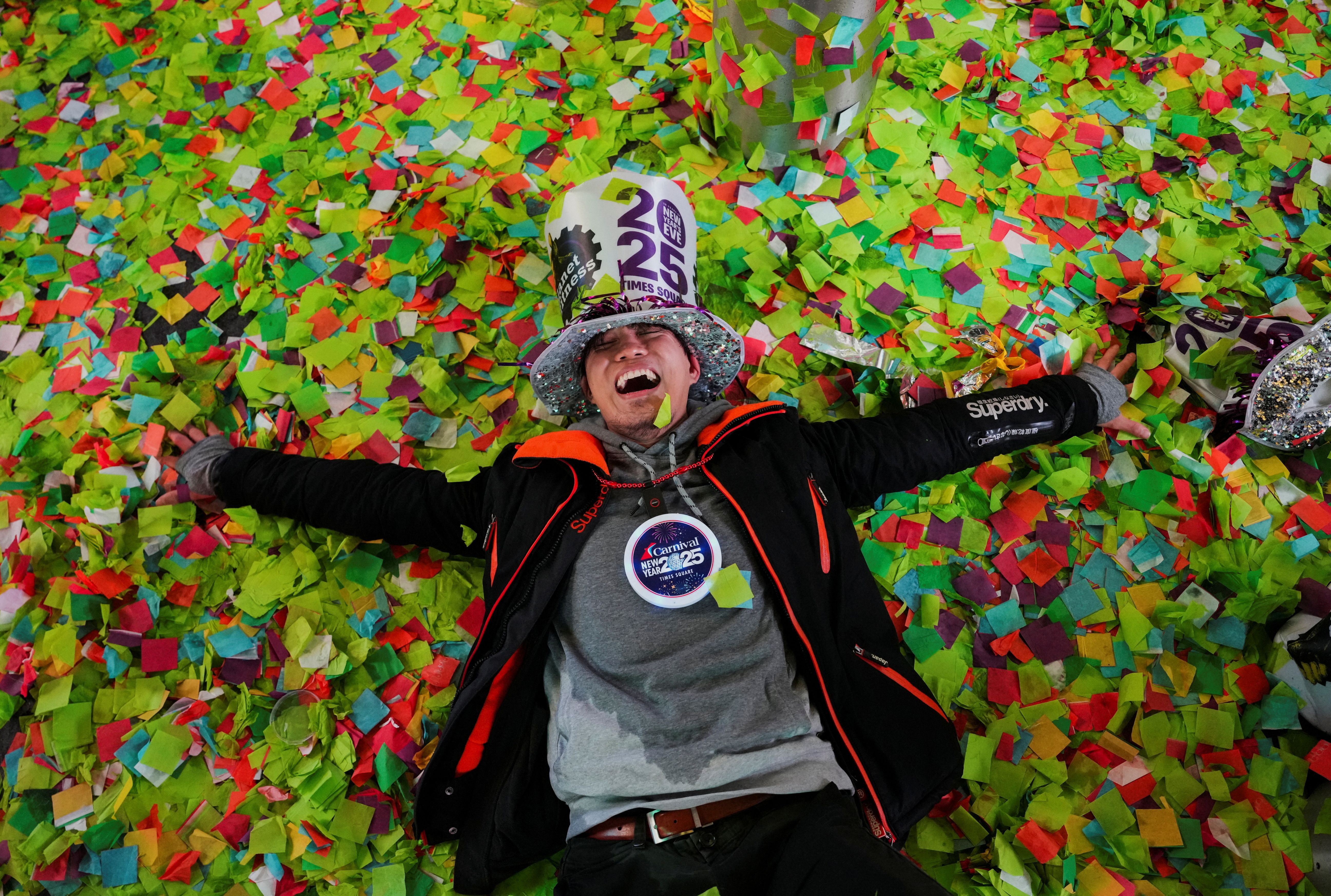 A man reacts while lying on top of confetti after the ball drop at Times Square during New Year's celebrations in New York City, U.S., January 1, 2025. (Photo by Adam Gray/Reuters)