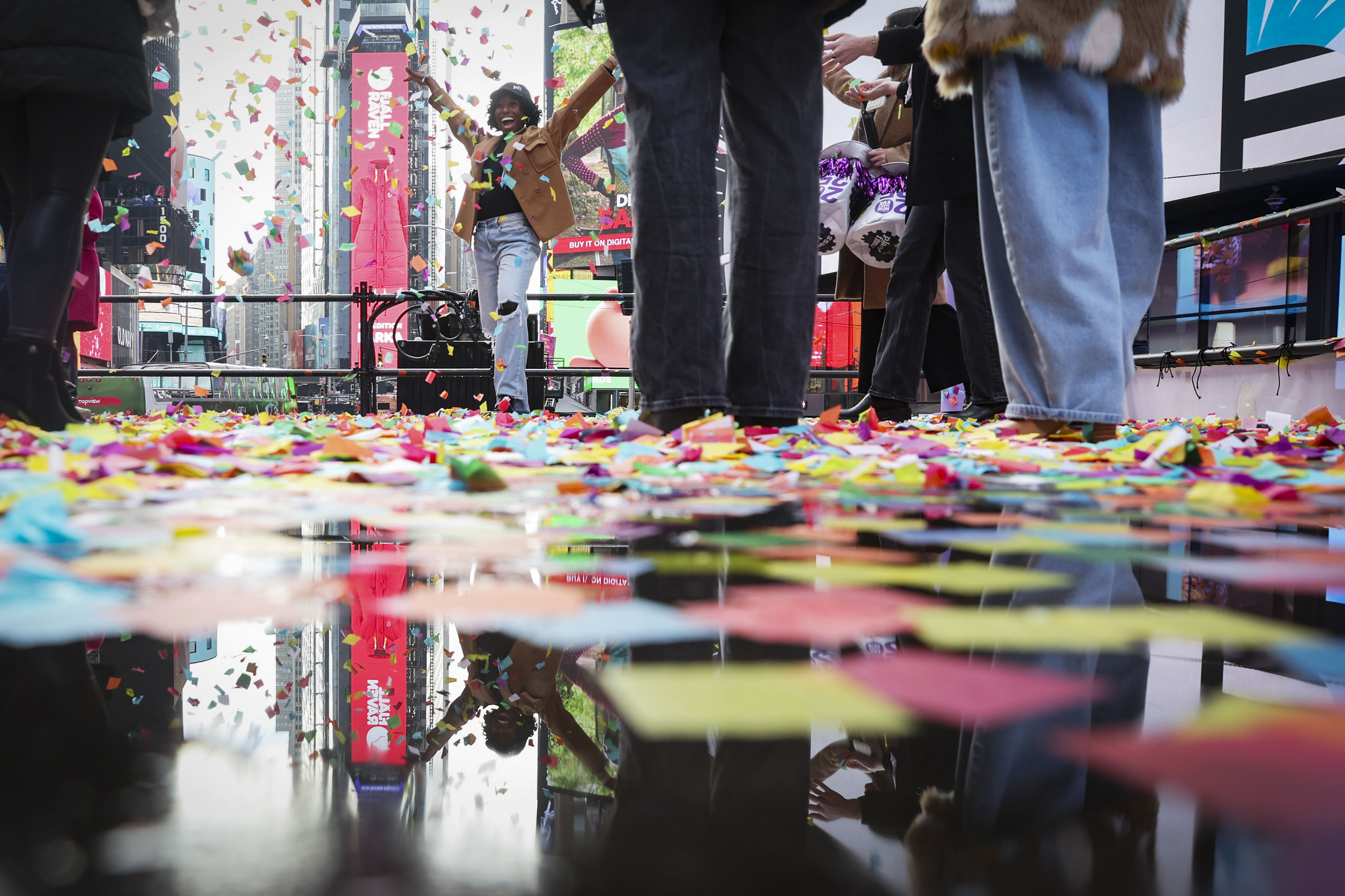 People pose for photos as they throw confetti ahead of New Year's Eve in Times Square, Sunday, December 29, 2024, in New York. (Photo by Heather Khalifa/AP Photo)