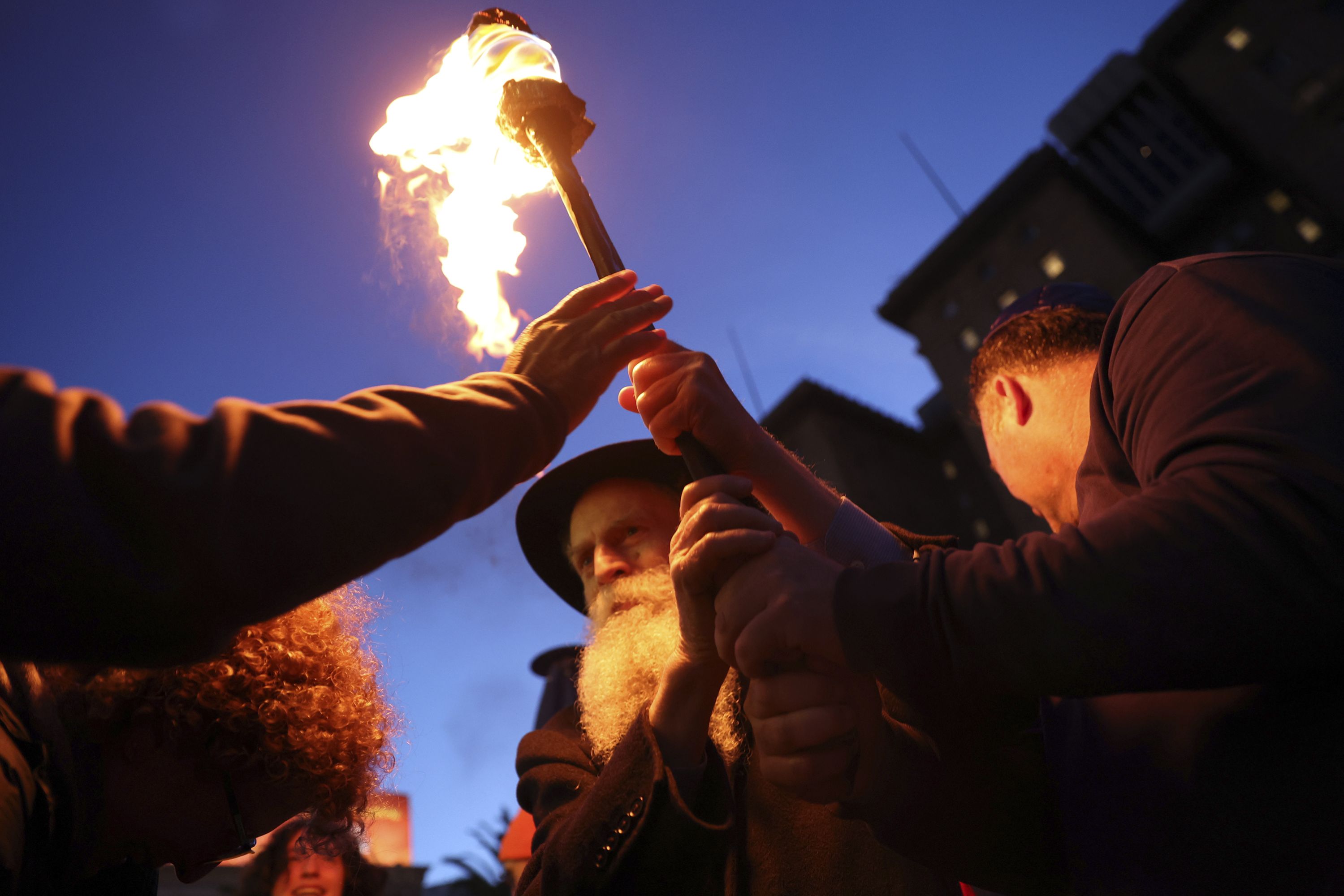 An attendee touches the torch held by Rabbi Yosef Langer that was used to light the Bill Graham Menorah during San Francisco's Hanukkah festival in Union Square in San Francisco on Sunday, December 29, 2024. (Photo by Scott Strazzante/San Francisco Chronicle via AP Photo)
