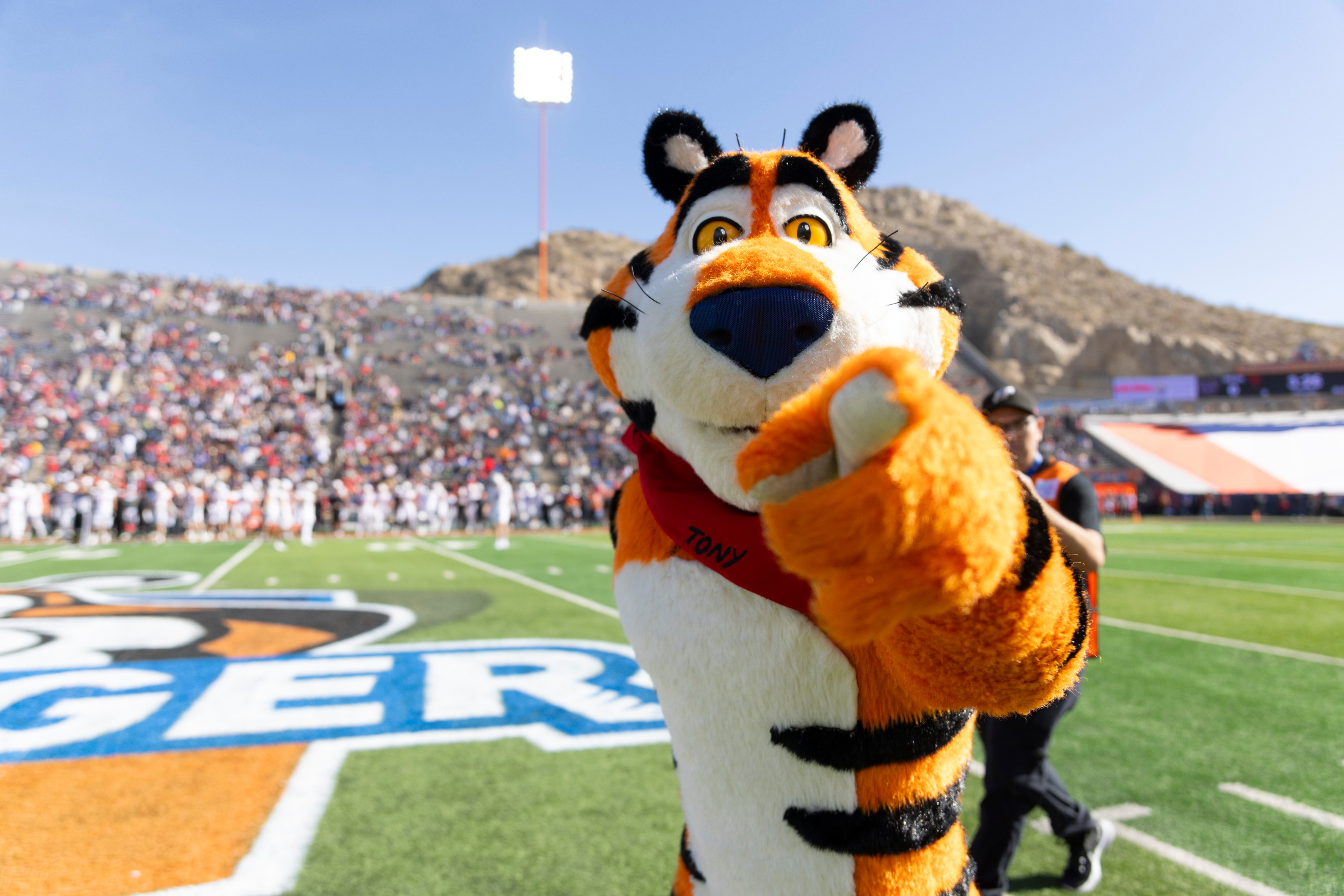 Tony the Tiger poses for a photo prior to the Tony the Tiger Sun Bowl Game on Tuesday, December 31, 2024 in El Paso, TX. (Photo by Jorge Salgado/AP Content Services for Kellogg's Frosted Flakes)
