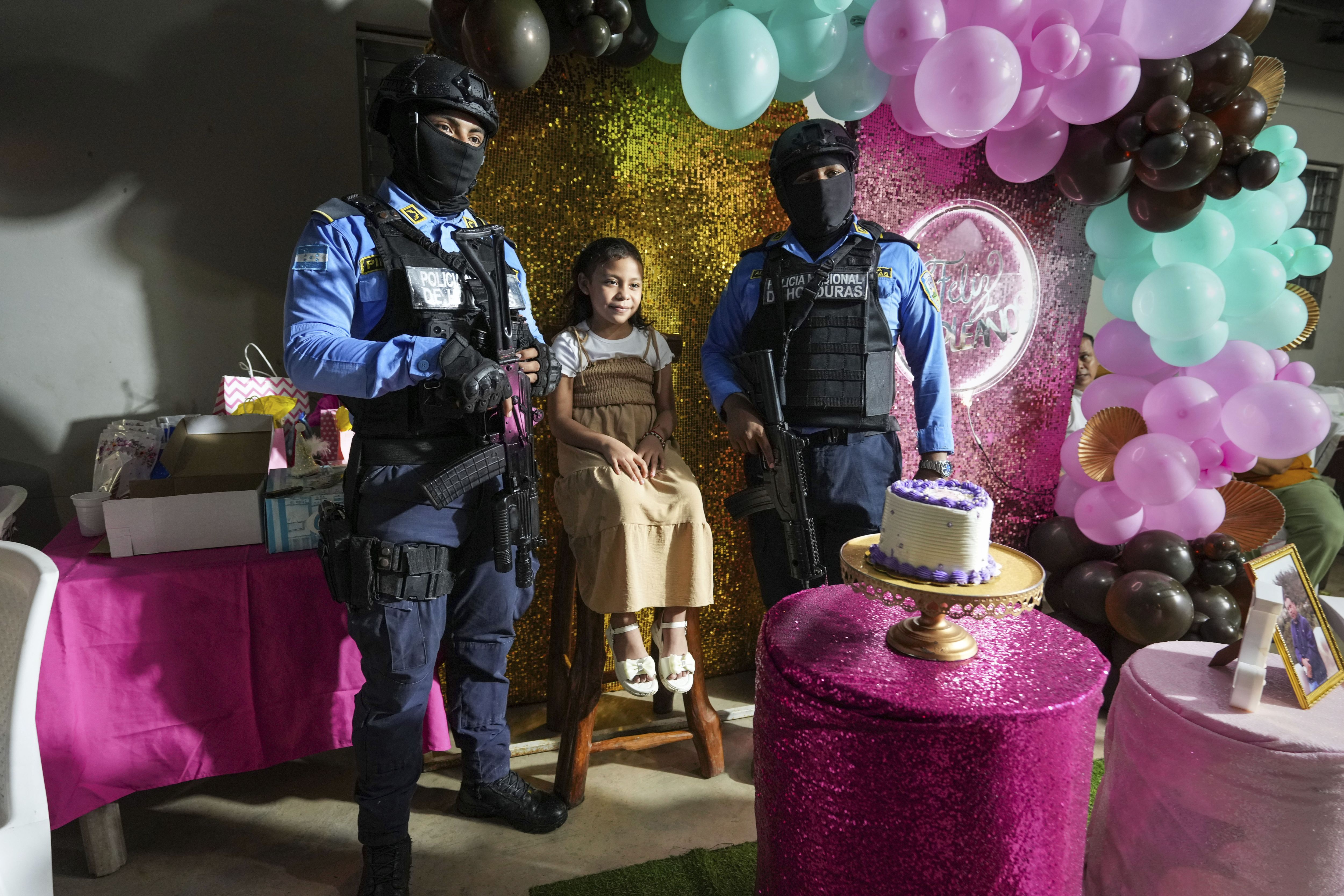 Julia Lopez Peña, the daughter of slain environmentalist Juan López, poses for a photo with her state-assigned bodyguards at her ninth birthday party in Tocoa, Honduras, December 7, 2024. (Photo by Moises Castillo/AP Photo)