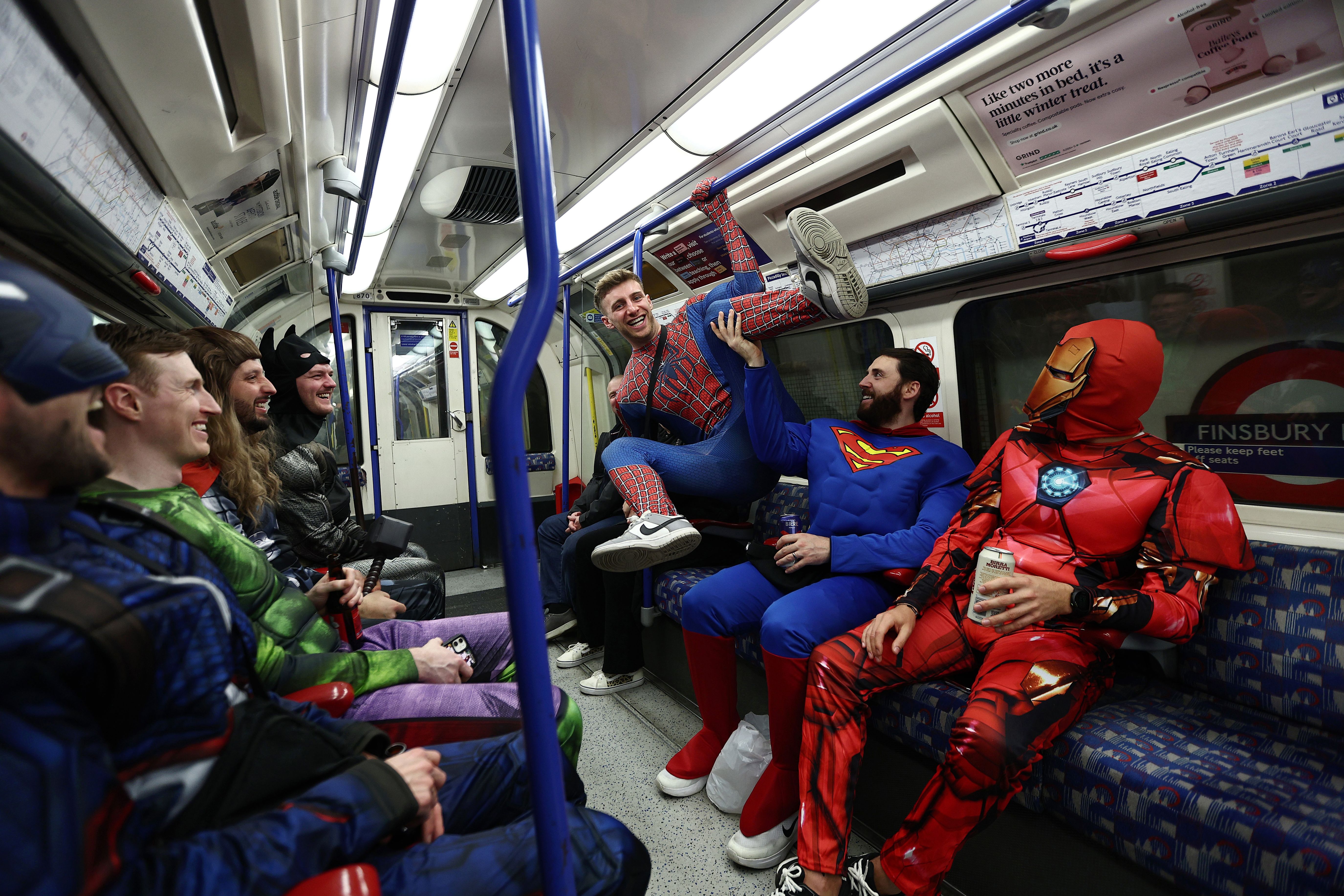 Fans wearing fancy dress travel on the Piccadilly Line on the London Underground prior to day thirteen of the 2024/25 Paddy Power World Darts Championship at Alexandra Palace on December 30, 2024 in London, England. (Photo by James Fearn/Getty Images)