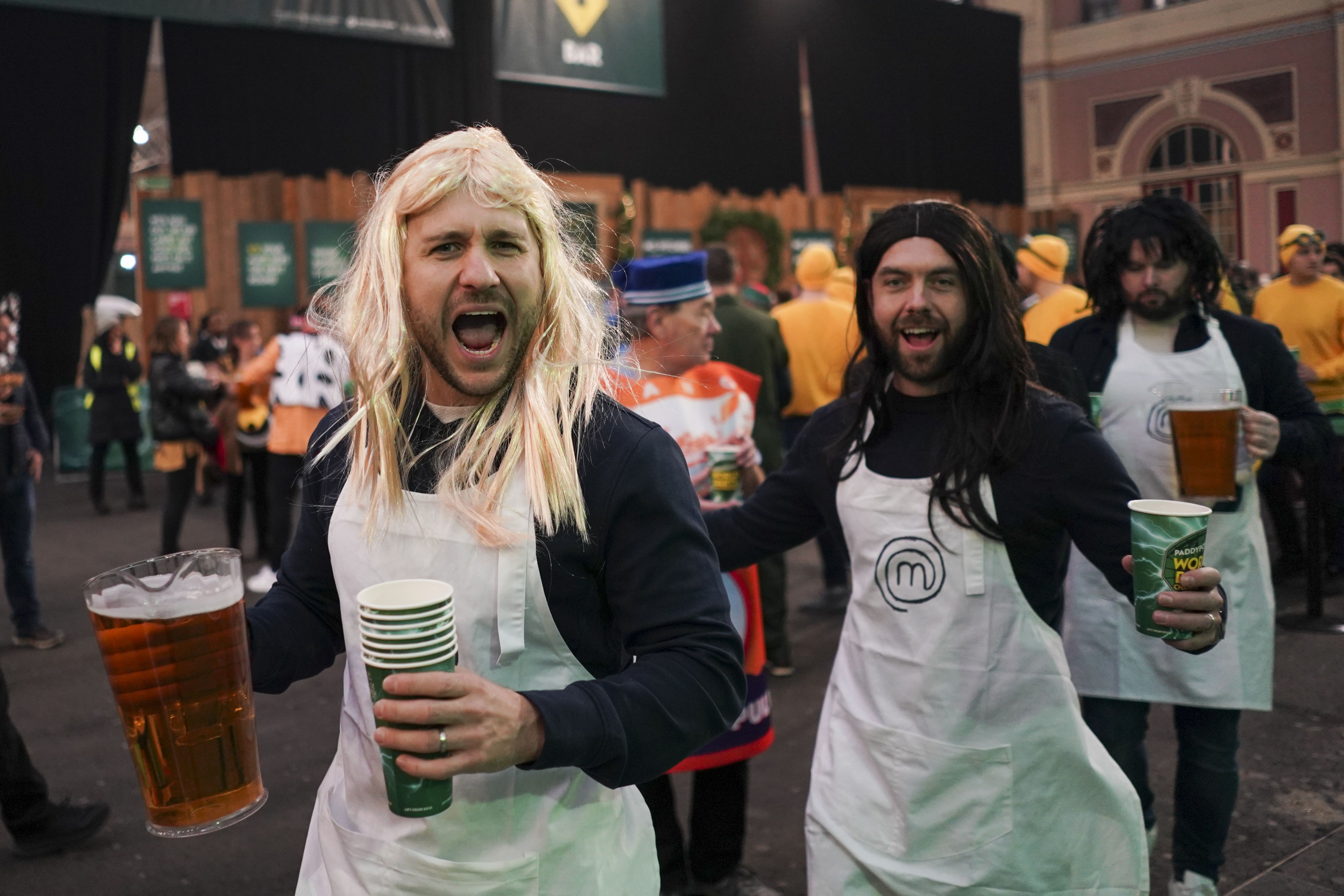 Fans dressed in costumes arrive for the start of the round 4 match between Kevin Doets of the Netherlands and Chris Dobey of England at the World Darts Championship in London, Monday, December 30, 2024. (Photo by Alberto Pezzali/AP Photo)