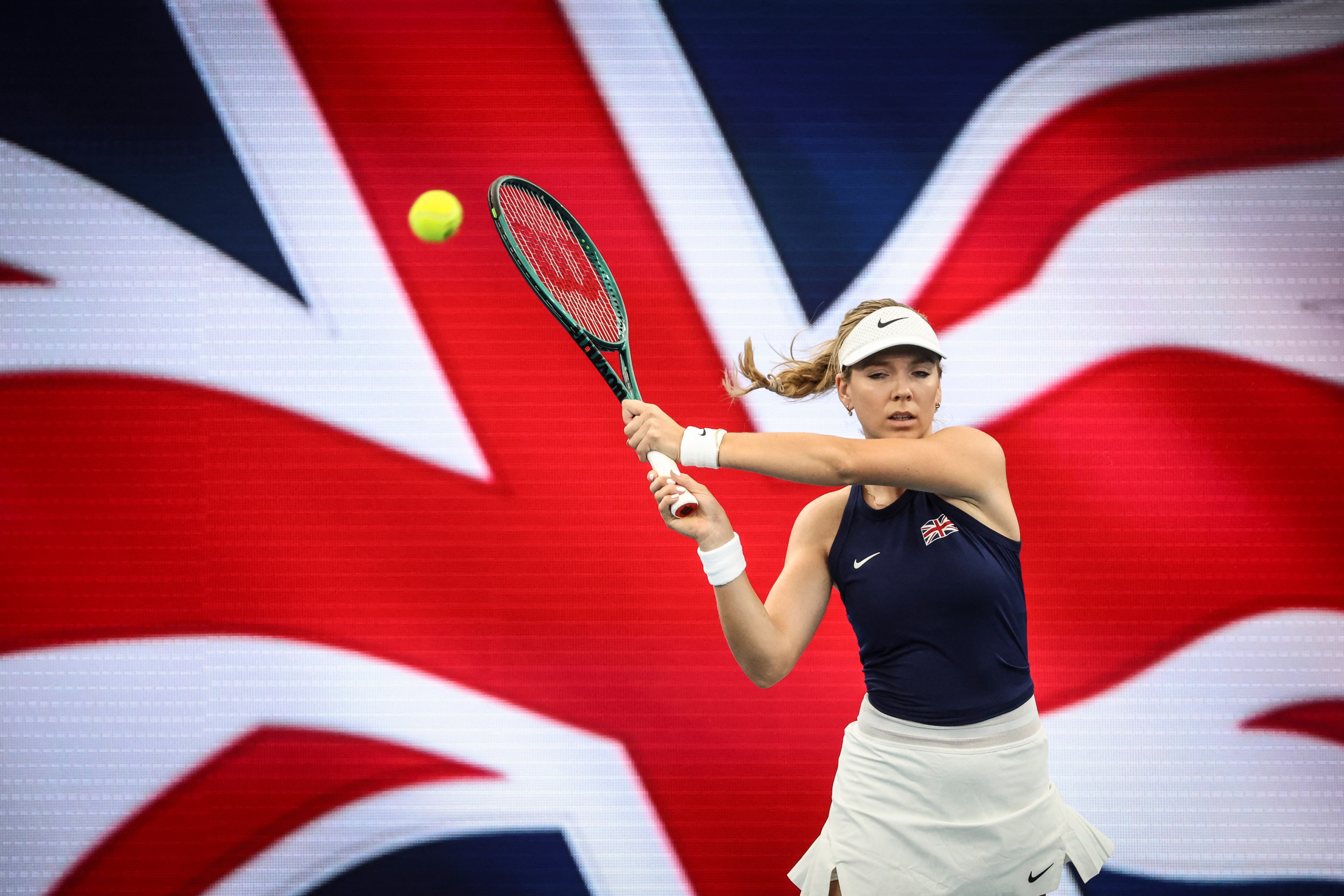 Katie Boulter, British tennis player, hits a shot during the warm-up before the start of her women's singles match against Argentina's Nadia Podoroska at the United Cup on Ken Rosewall Arena in Sydney on December 30, 2024. (Photo by David Gray/AFP Photo)