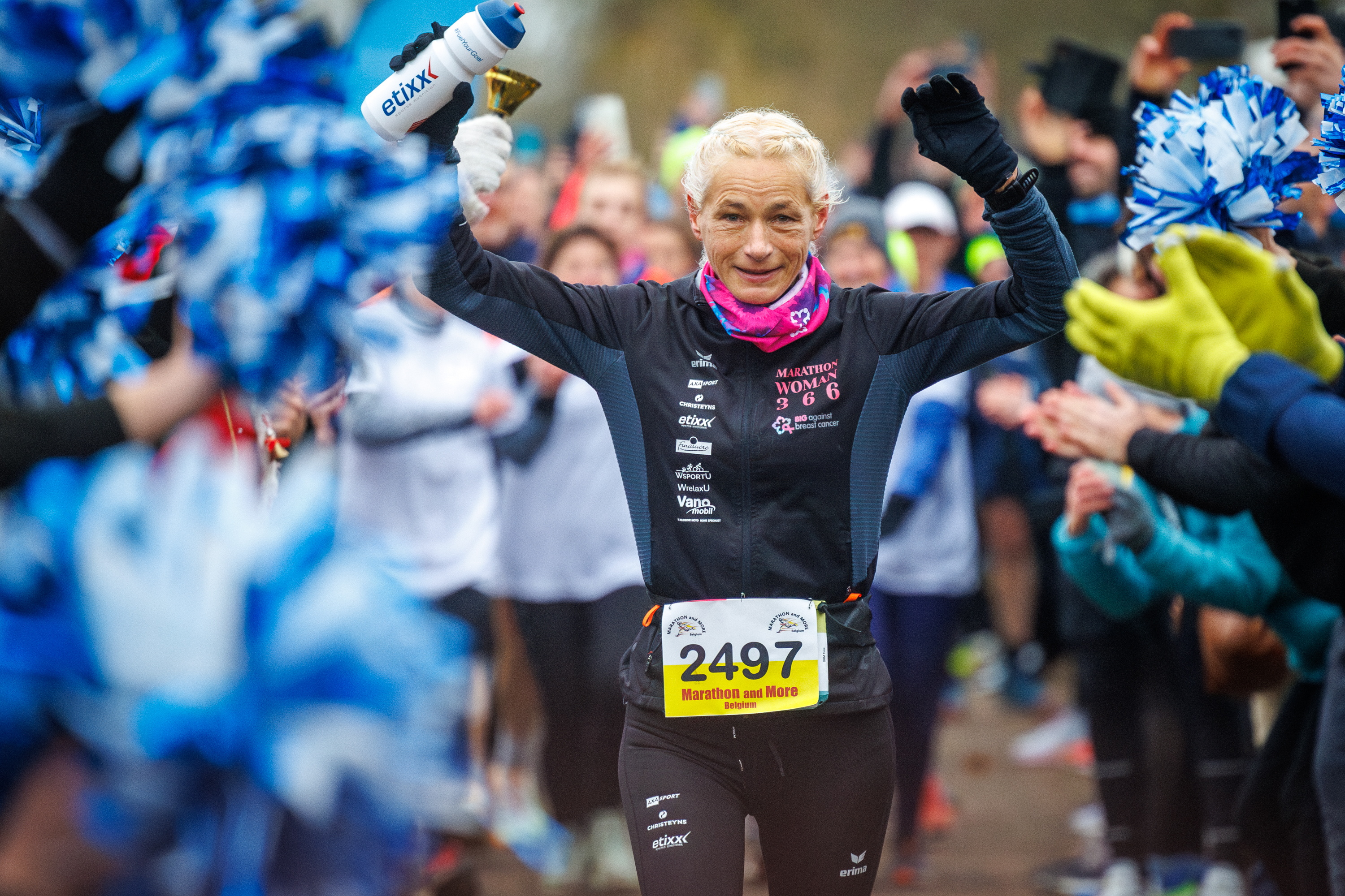 Marathon runner Hilde Dosogne finishes her 366th marathon of the year 2024 in aid of BIG (Breast International Group) to fight against breast cancer in Ghent, Belgium, 31 December 2024. Dosogne, who is also known as MarathonWoman, broke the unofficial Guinness World Record in May by completing her 151st consecutive daily marathon. (Photo by Olivier Matthys/EPA)