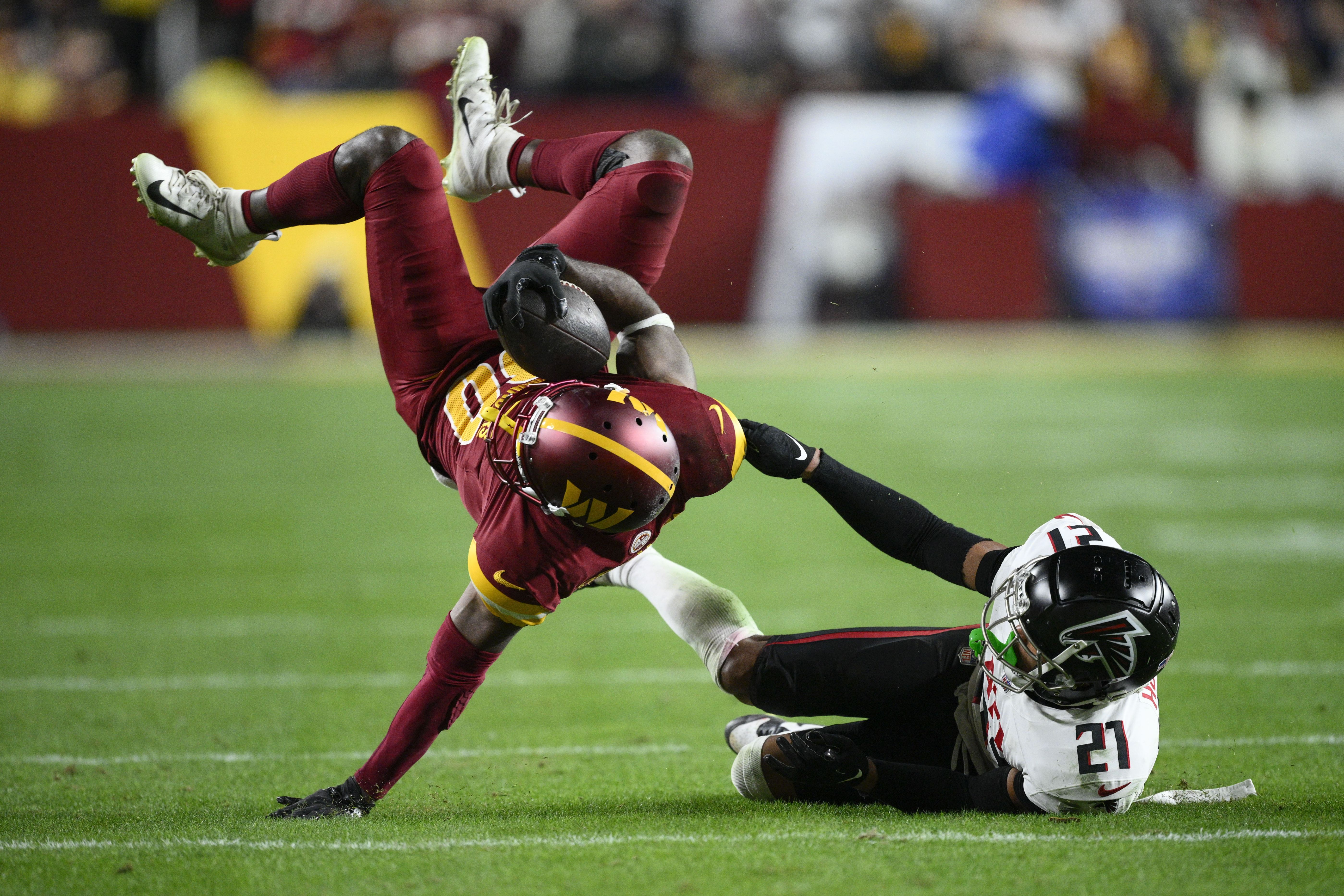Washington Commanders wide receiver Jamison Crowder is tackled by Atlanta Falcons cornerback Mike Hughes (21) during the second half of an NFL football game, Sunday, December 29, 2024, in Landover, Md. (Photo by Nick Wass/AP Photo)