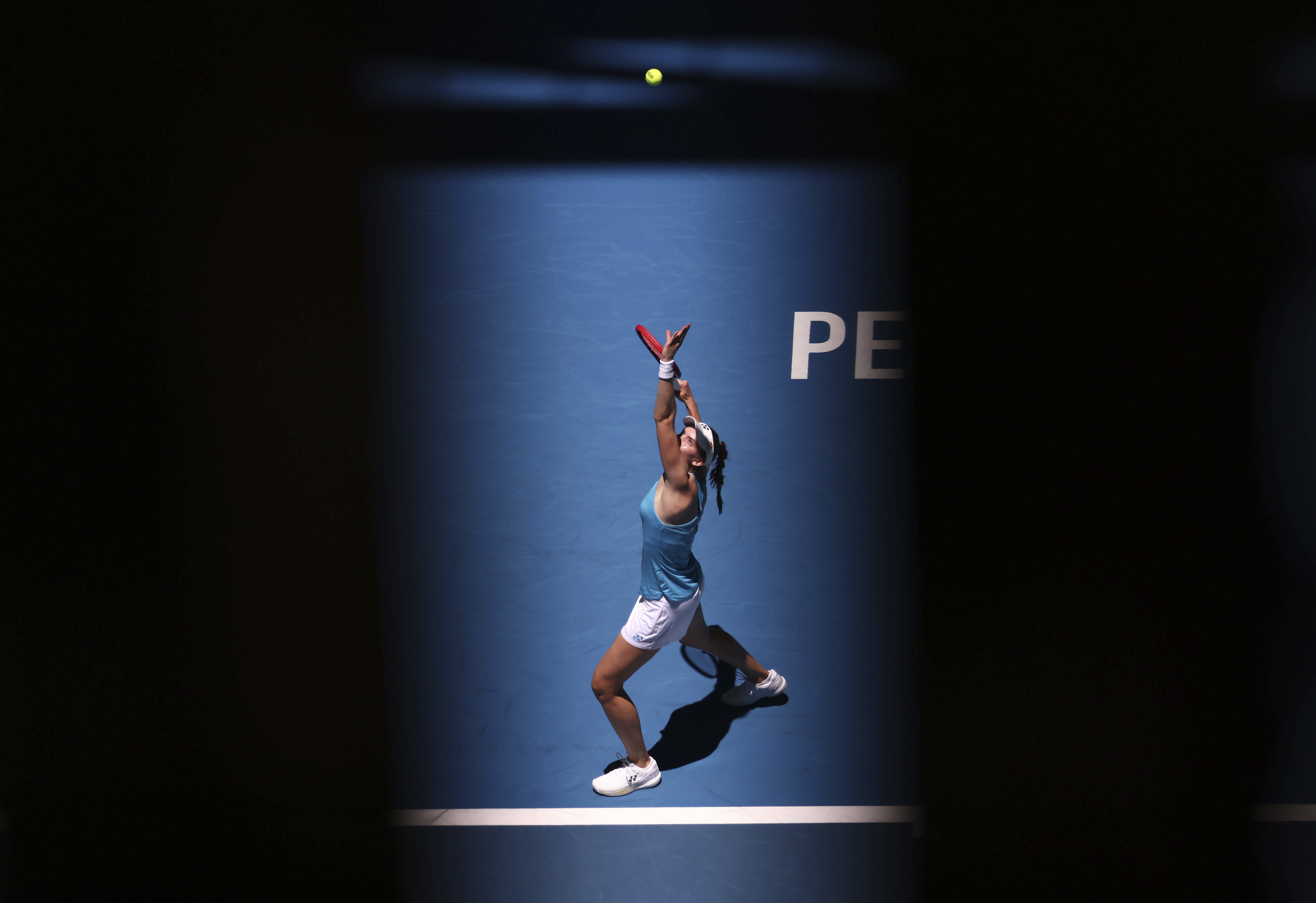 Elena Rybakina of Kazakhstan serves to Jessica Bouzas Maneiro of Spain during their United Cup tennis match in Perth, Australia, Friday, December 27, 2024. (Photo by Trevor Collens/AP Photo)