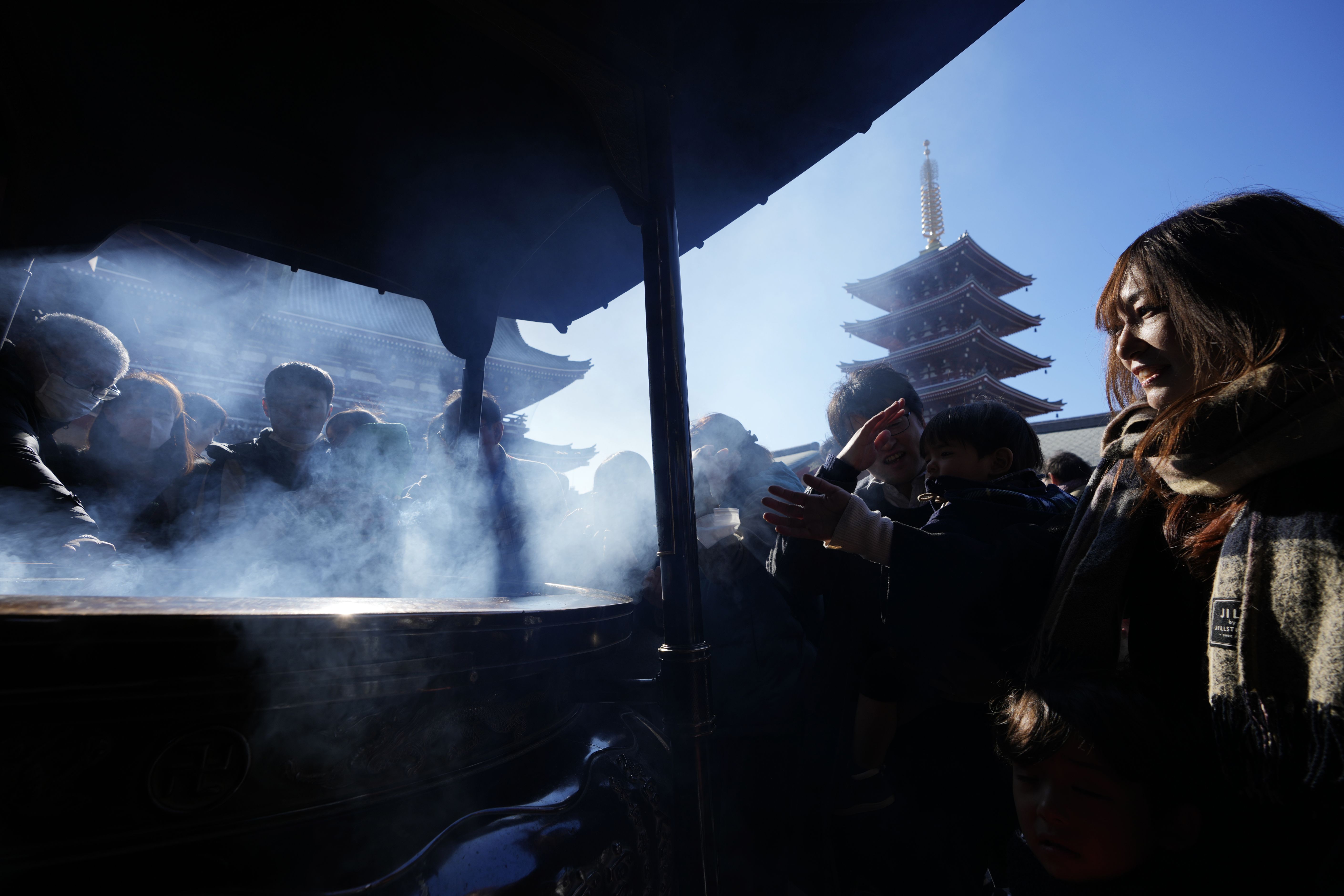 Visitors bathe in incense smoke as part of a ritual to cleanse themselves before heading to the main hall of Sensoji Buddhist temple on New Year's Eve in Tokyo, Tuesday, December 31, 2024. (Photo by Hiro Komae/AP Photo)