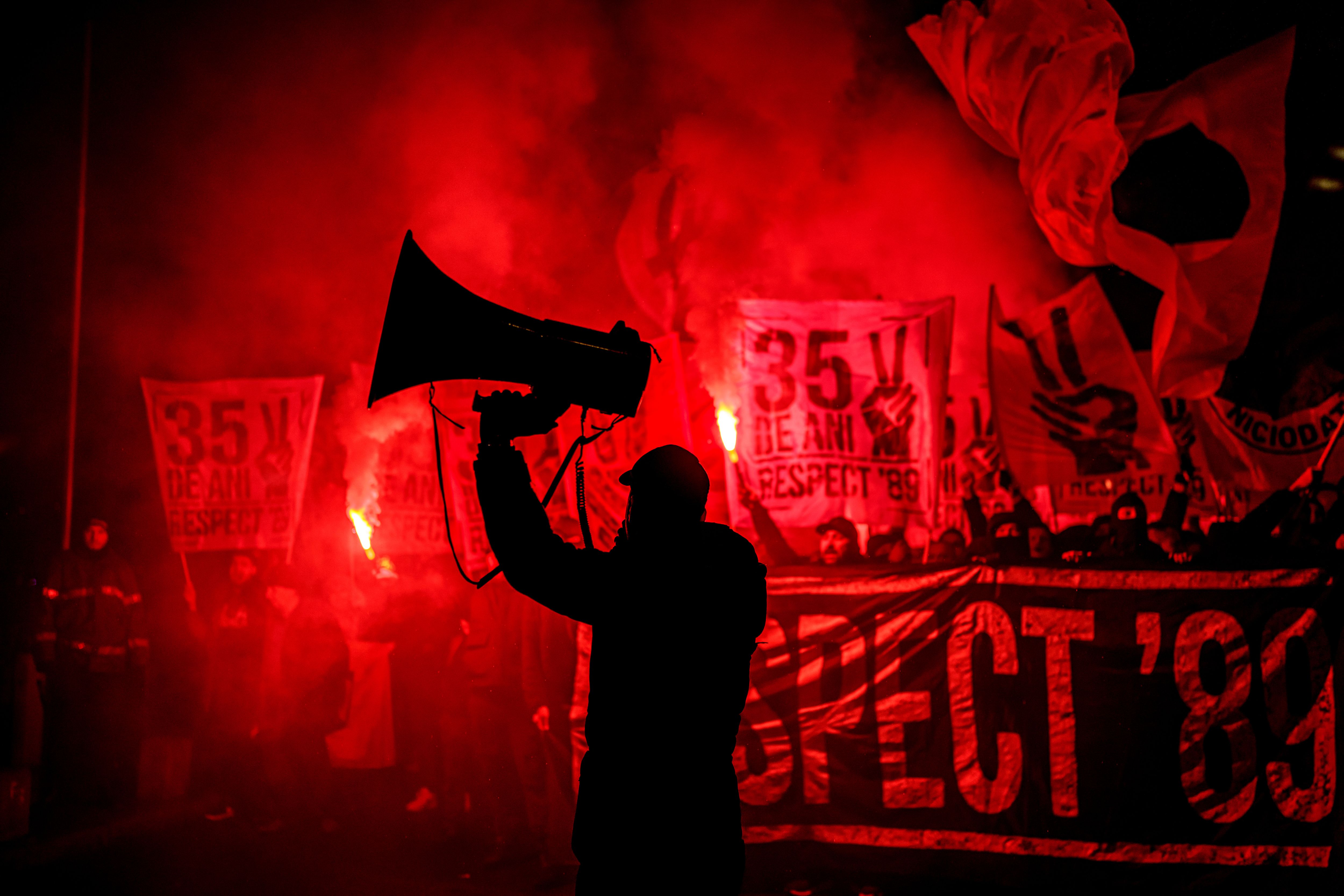 People light flares during and event dubbed “The March of Heroes” in Bucharest, Romania, Saturday, December 21, 2024, on the 35th anniversary of the 1989 uprising that toppled the regime of communist dictator Nicolae Ceausescu. (Photo by Andreea Alexandru/AP Photo)