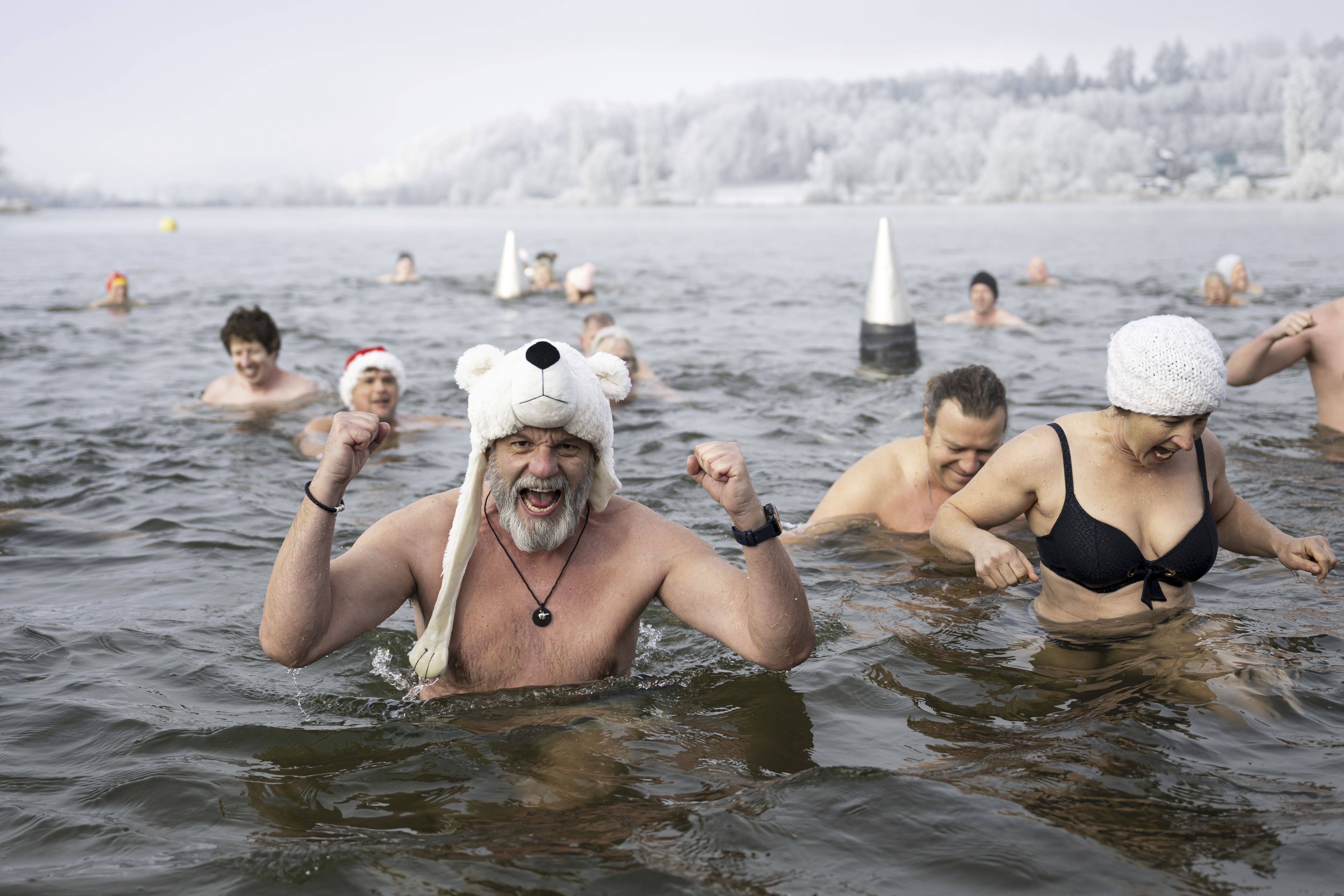 Swimmers attend the traditional New Year's Eve swimming at Lake Moossee in Moosseedorf, Switzerland, Tuesday, December 31, 2024. (Photo by Anthony Anex/Keystone via AP Photo)