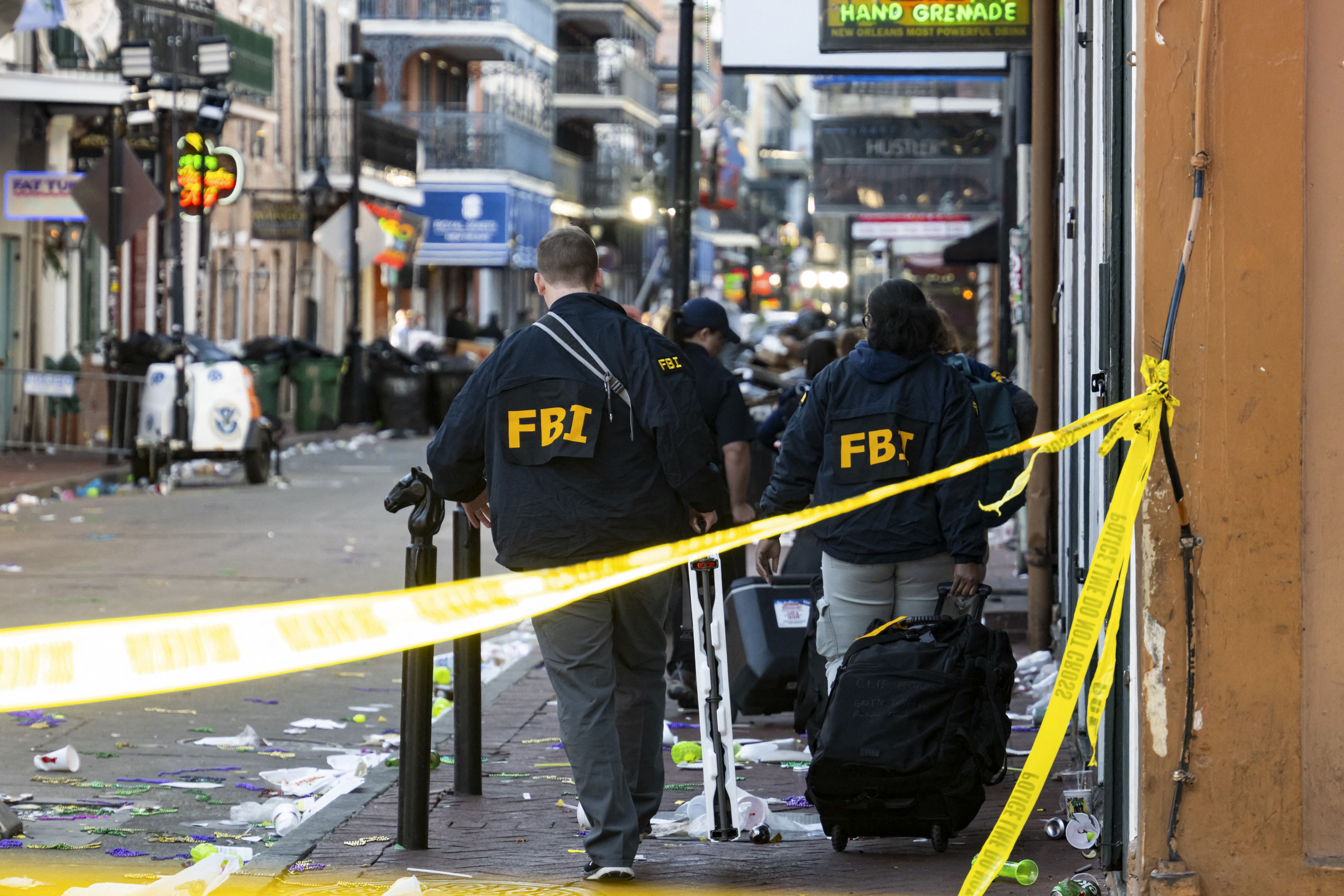 FBI investigators arrive at the scene where the white Ford F-150 pickup truck that crashed into a work lift after allegedly driving into a crowd of New Year's revelers in the French Quarter of New Orleans, Louisiana, on January 1, 2025. At least 10 people were killed and 30 injured Wednesday when a vehicle plowed overnight into a New year's crowd in the heart of the thriving New Orleans tourist district, authorities in the southern US city said. (Photo by Matthew Hinton/AFP Photo)
