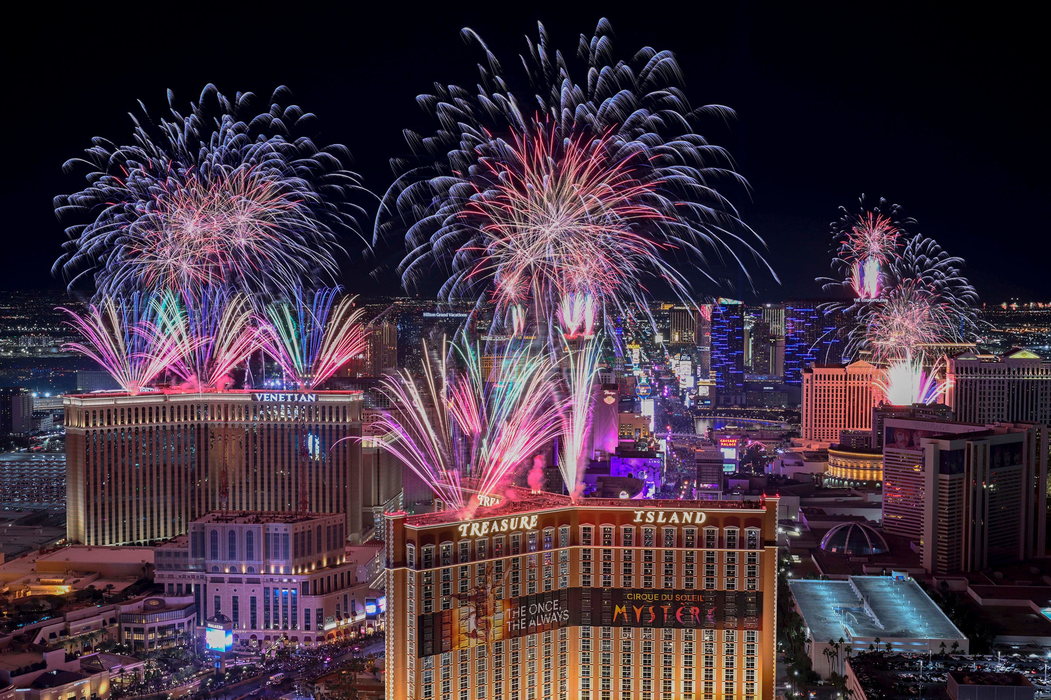 Fireworks explode over the Las Vegas Strip during a New Year's Eve celebration Wednesday, January 1, 2025, in Las Vegas. (Photo by David Becker/AP Photo)