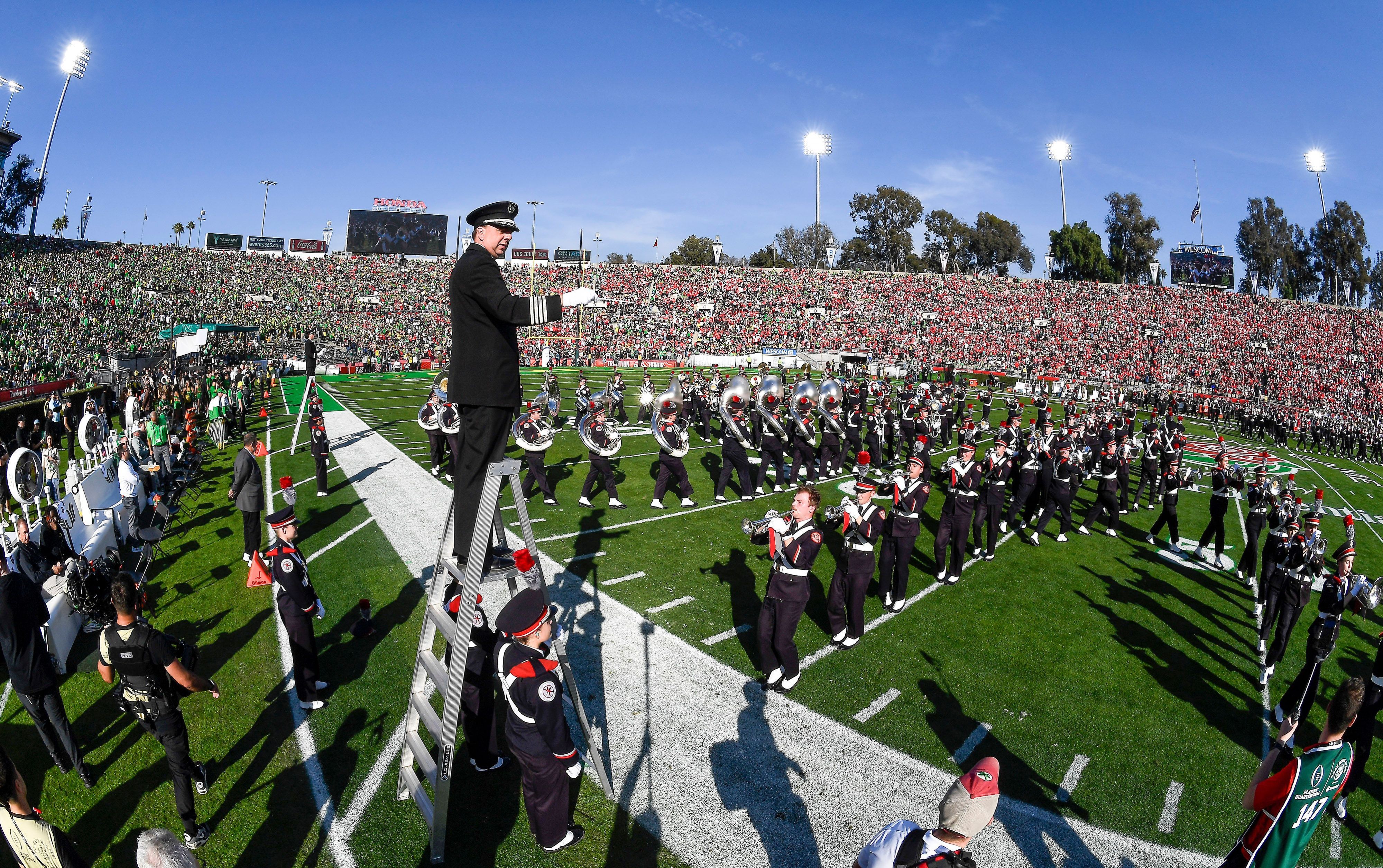 The Ohio State University marching band performs before the college football playoffs quarter-final at the Rose Bowl stadium in Pasadena, California on January 2, 2025. (Photo by Jon SooHoo/UPI/Rex Features/Shutterstock)