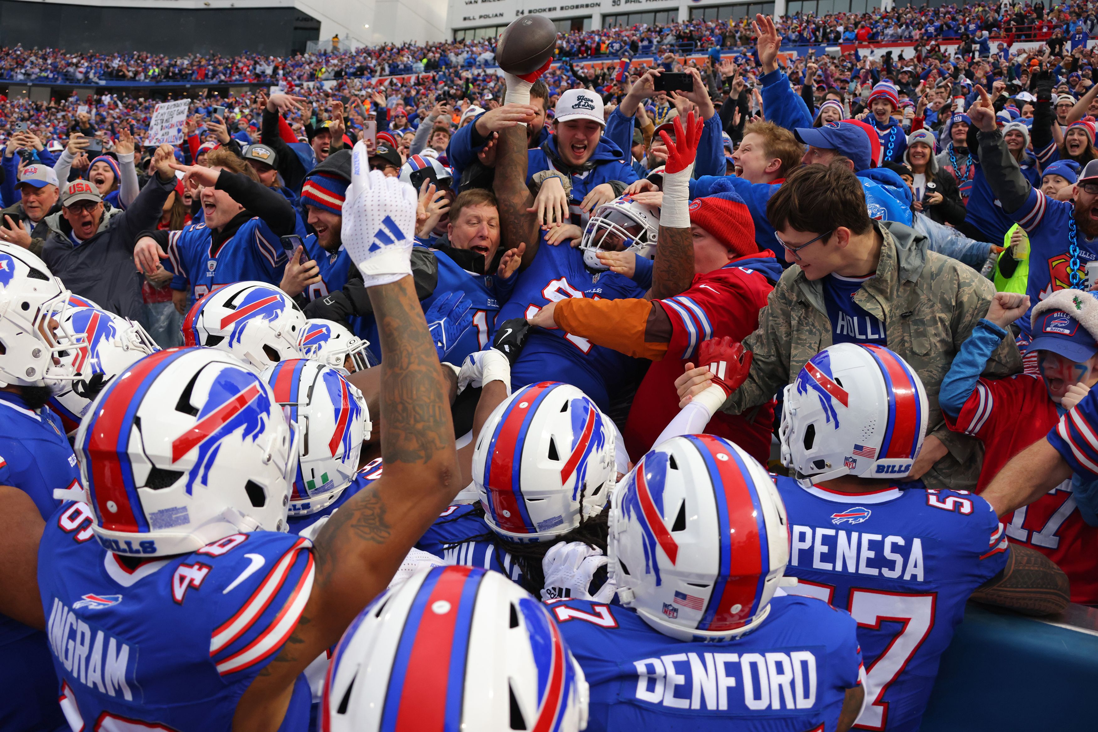 Jordan Phillips #97 of the Buffalo Bills jumps in the stands to celebrate his interception with fans during a game against the New York Jets at Highmark Stadium on December 29, 2024 in Orchard Park, New York. (Photo by Timothy T Ludwig/Getty Images)