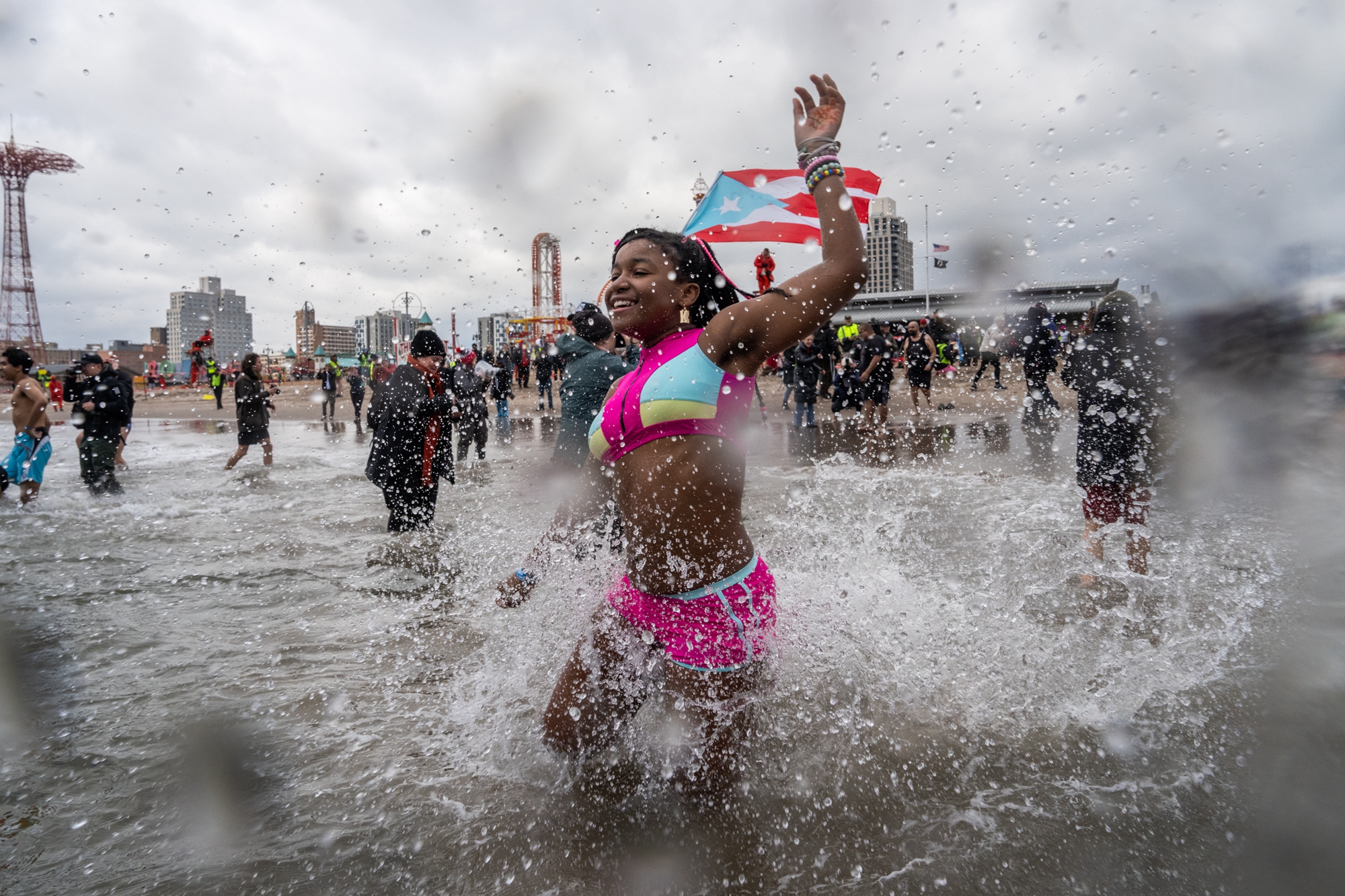 People participate in the 122nd annual Polar Bear Plunge in Coney Island on January 1, 2025 in the Brooklyn borough of New York City. The New Year's Day event expects over 4,000 swimmers this year, with the Coney Island Polar Bear Club being the oldest winter bathing club in the United States, dating back to 1903. (Photo by Adam Gray/Getty Images)