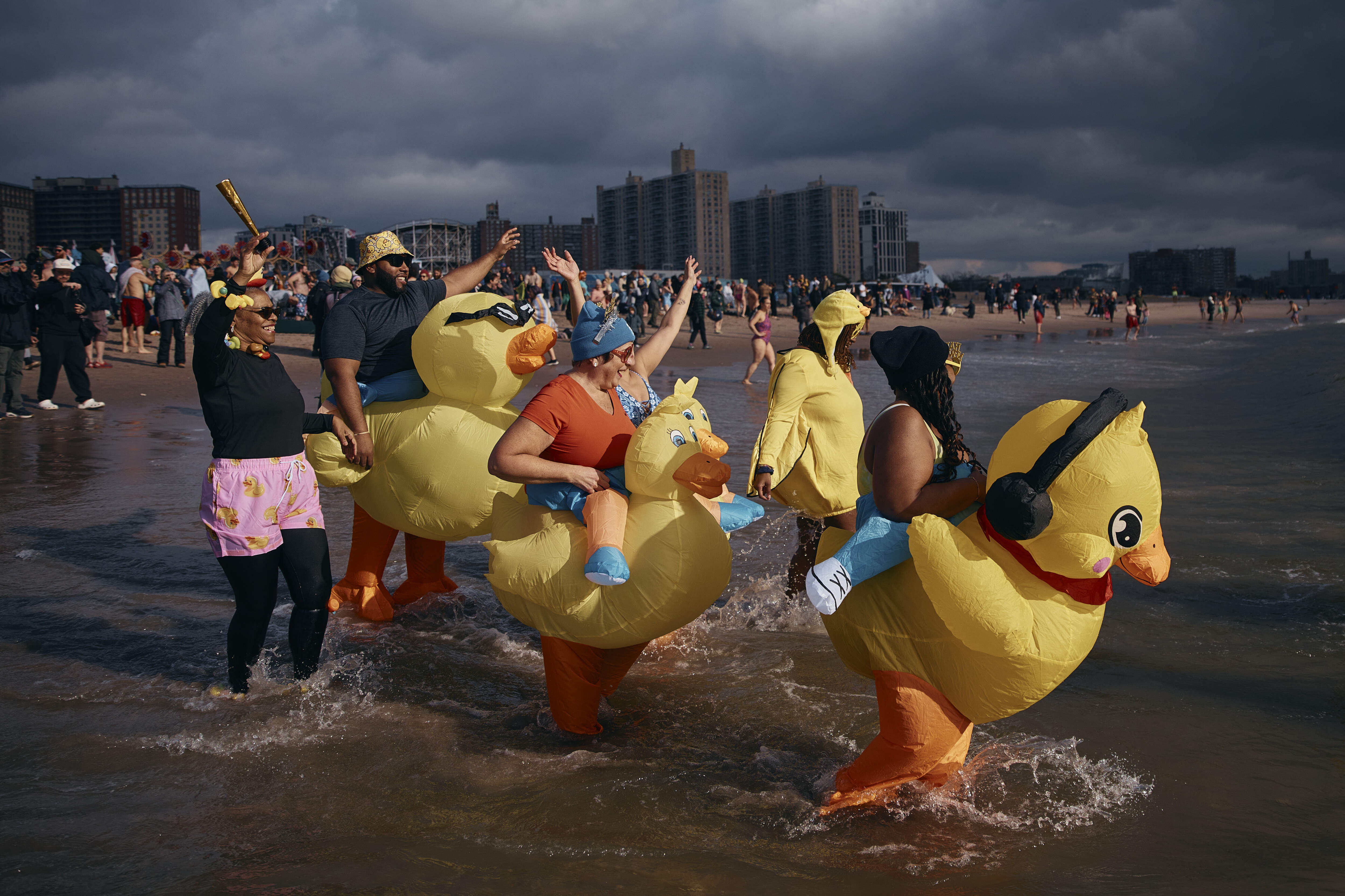 Revelers in a costume enter the cold water during the annual Polar Bear Plunge on New Year's Day, Wednesday, January 1, 2025, in New York. (Photo by Andres Kudacki/AP Photo)