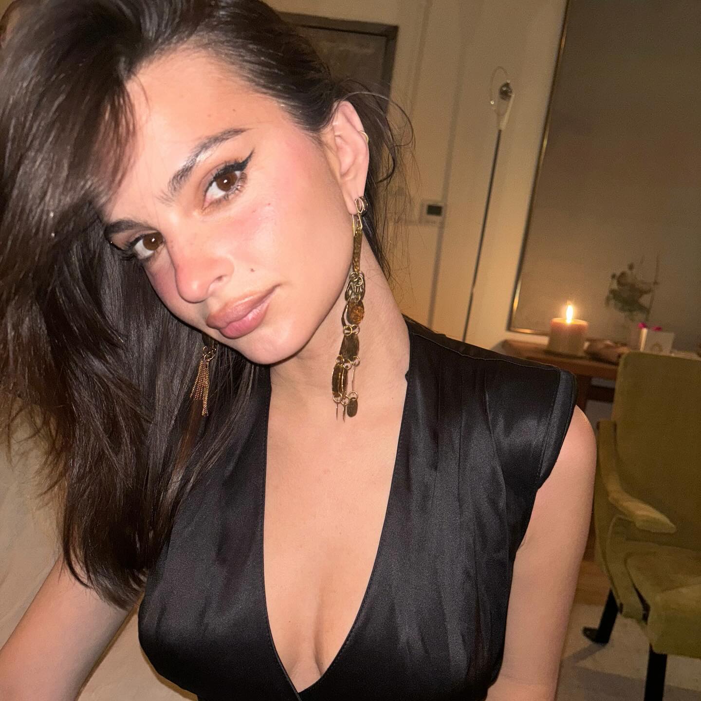 American model Emily Ratajkowski sports black winged eyeliner and large earrings on Christmas on December 25, 2024. (Photo by emrata/Instagram)