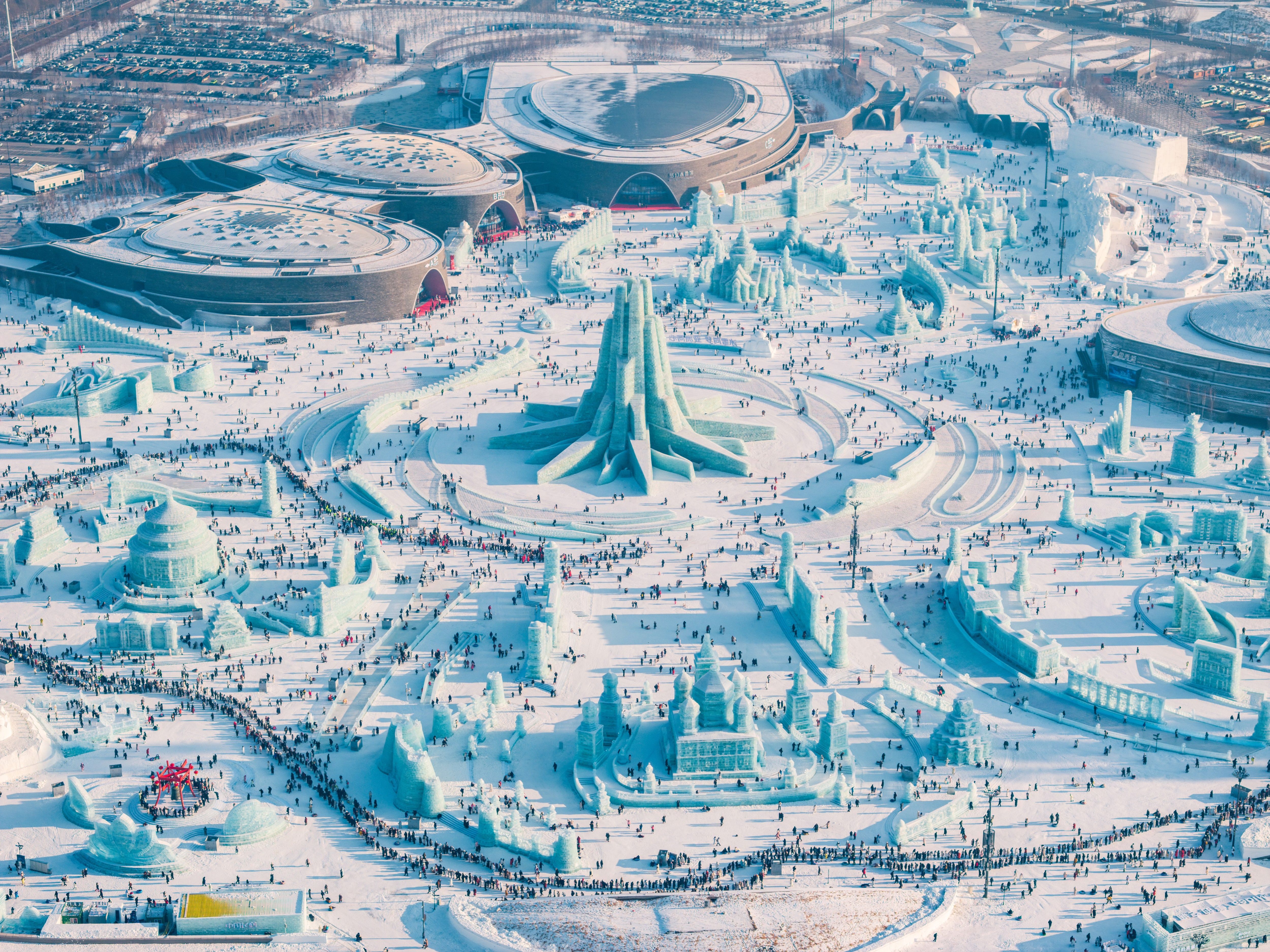 Aerial view of tourists visiting the 26th Harbin Ice and Snow World on December 21, 2024 in Harbin, Heilongjiang Province of China. The world's largest ice-and-snow theme park, the 26th edition of the Harbin Ice-Snow World, officially opened at 10 a.m. on December 21 in Harbin, the capital city of northeast China's Heilongjiang Province. (Photo by Su Yunpeng/VCG via Getty Images)