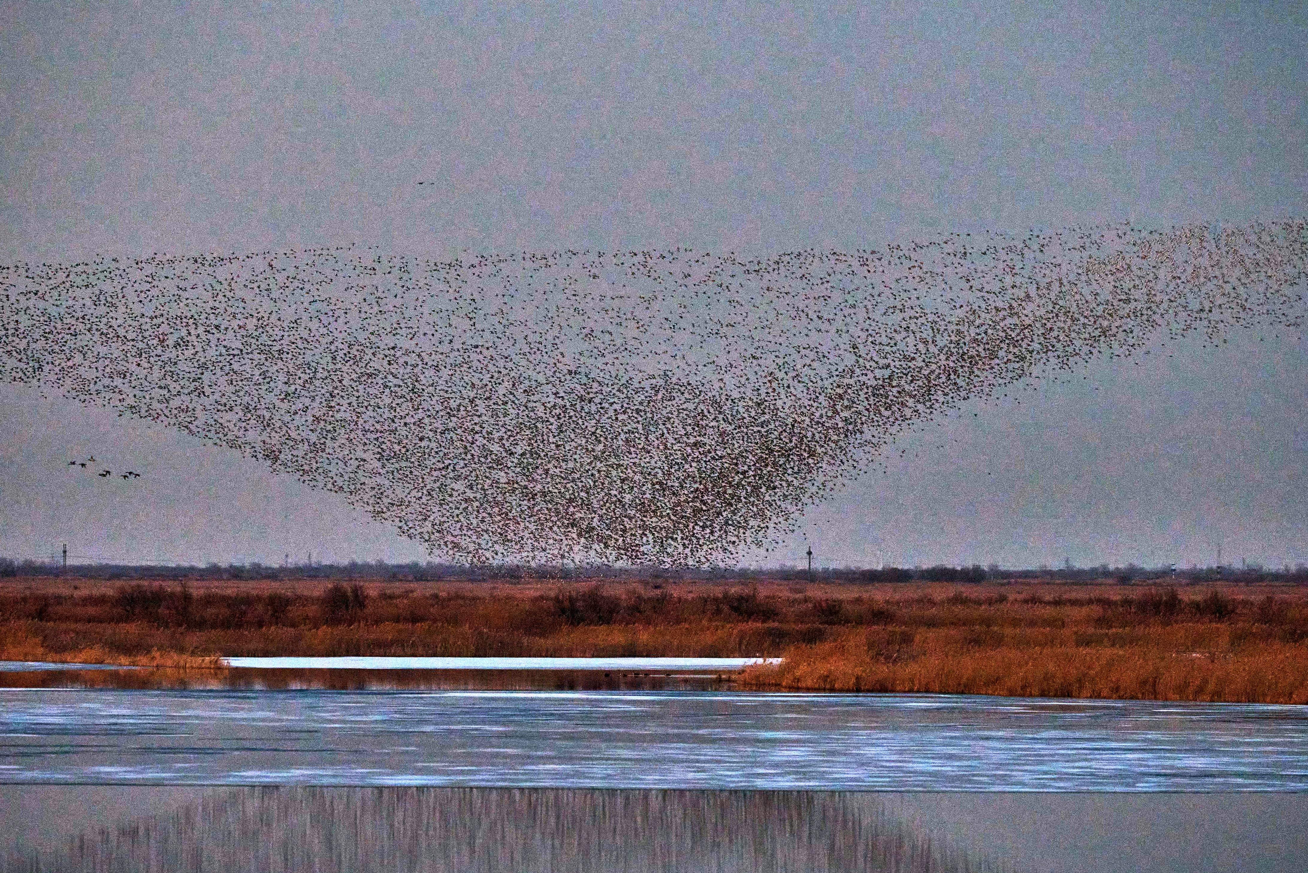 This photo taken on December 22, 2024 shows a flock of migrating birds flying above the wetlands at Yellow River Delta National Nature Reserve in Dongying, east China's Shandong province. The Yellow River Delta National Nature Reserve (YRDNNR) is a protected area in the city of Dongying, China, which covers wetland habitats on the shore of the Bohai Sea. (Photo by AFP Photo/China Stringer Network)
