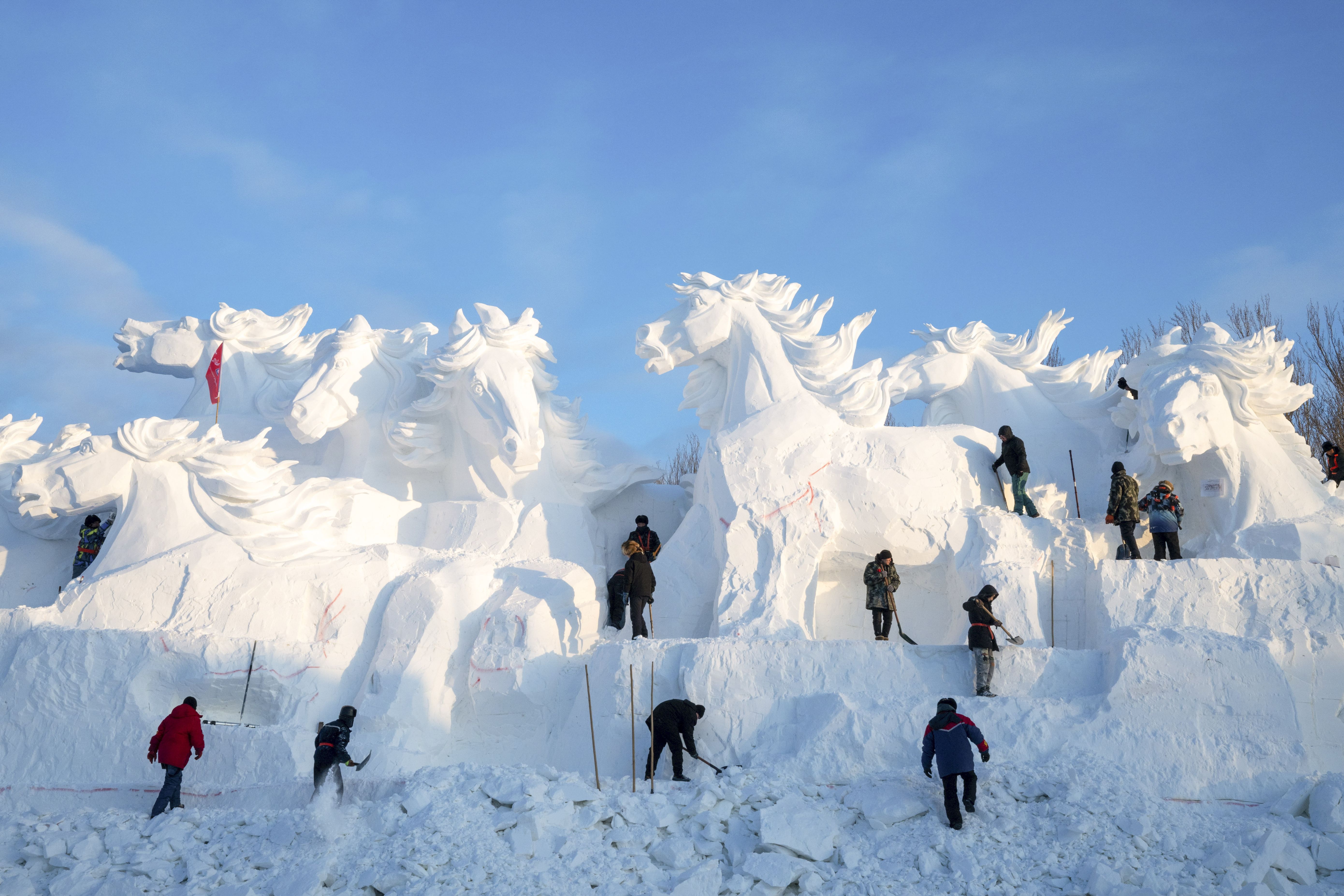 Sculptors work on a giant snow sculpture at the 37th Sun Island International Snow Sculpture Expo in Harbin, northeast China's Heilongjiang Province, 23 December 2024. The 37th Sun Island International Snow Sculpture Expo began its trial operation here Monday. (Phoot by Zhang Tao/EPA/Xinhua News Agency)