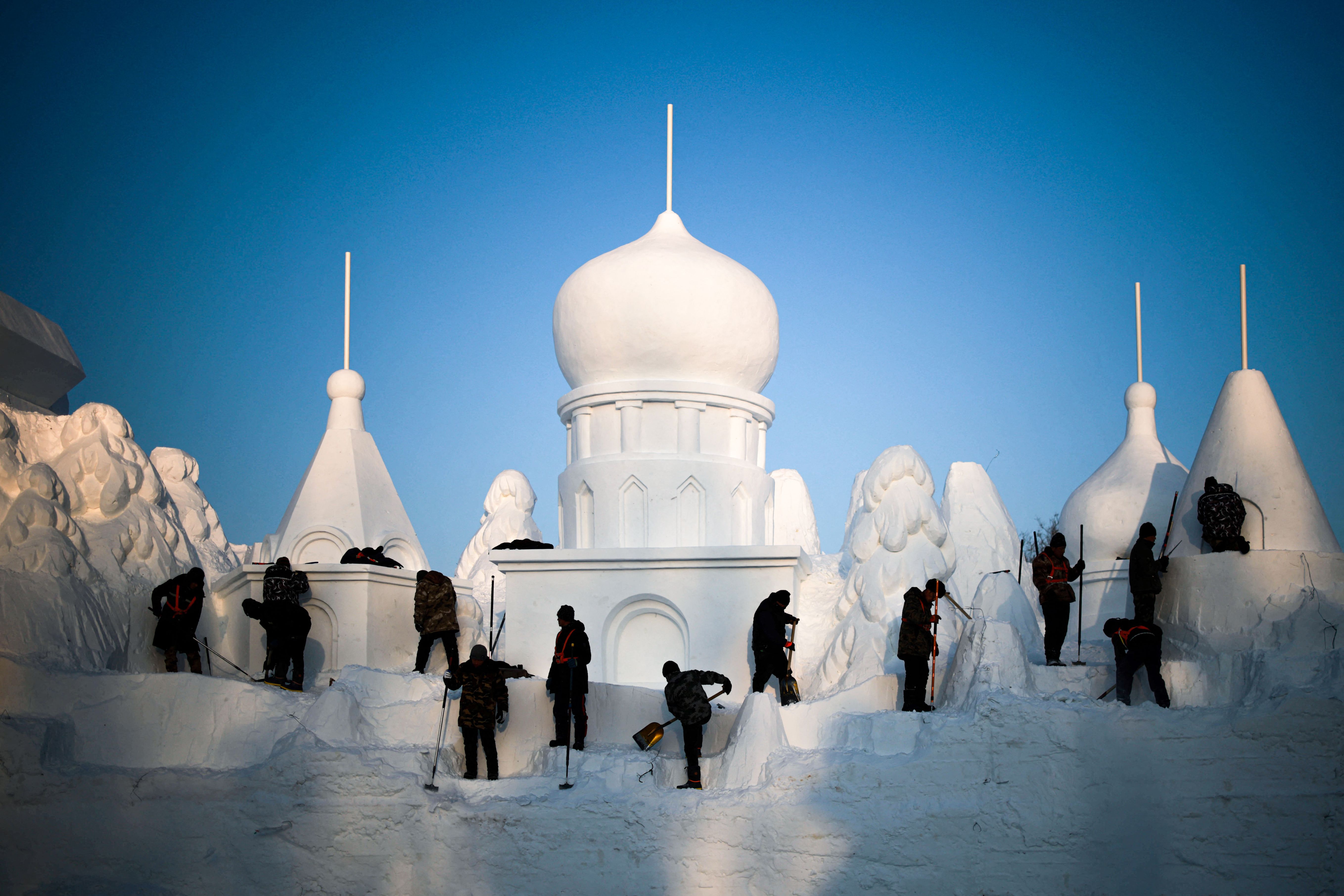 Men work on ice sculptures during the 37th Sun Island International Snow Sculpture Art Expo in Harbin, in China's northeastern Heilongjiang province on December 25, 2024. (Photo by AFP Photo/China Stringer Network)