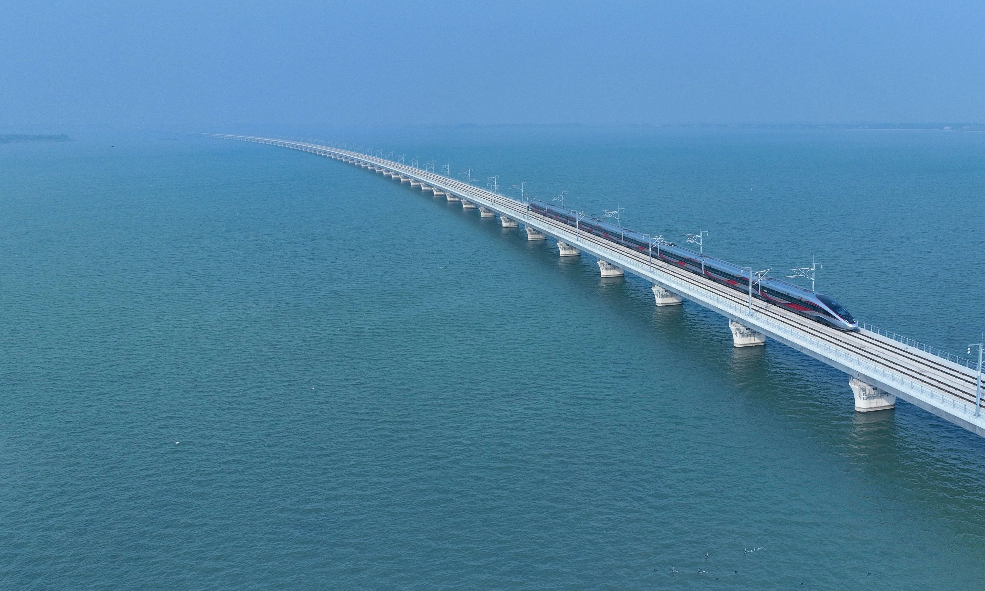An aerial drone photo shows a train passing through the Yuandang Lake section of the Shanghai-Suzhou-Huzhou high-speed railway on December 26, 2024. A newly constructed high-speed railway began operations on Thursday, enhancing the rail network connecting major cities in east China's Yangtze River Delta Region, a key economic powerhouse of the country. With a designed speed of 350 km per hour and eight stations, the Shanghai-Suzhou-Huzhou high-speed railway spanning 164 km links Shanghai Hongqiao Station with the city of Suzhou City in Jiangsu Province and Huzhou City in Zhejiang Province. (Photo by Xinhua News Agency/Rex Features/Shutterstock)