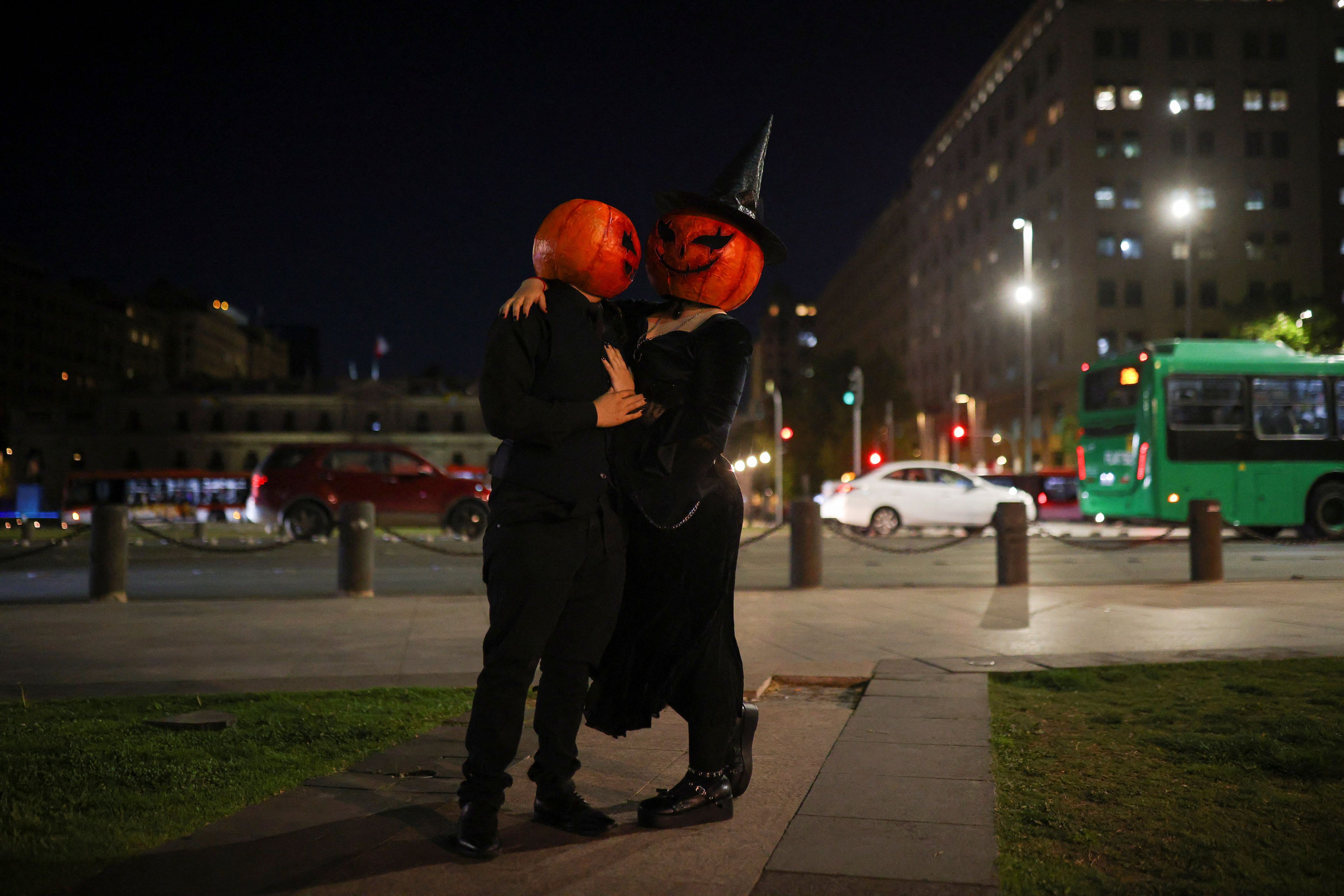 A couple in costume pose for a photo on Halloween night in Santiago, Chile on October 31, 2023. (Photo by Pablo Sanhueza/Reuters)
