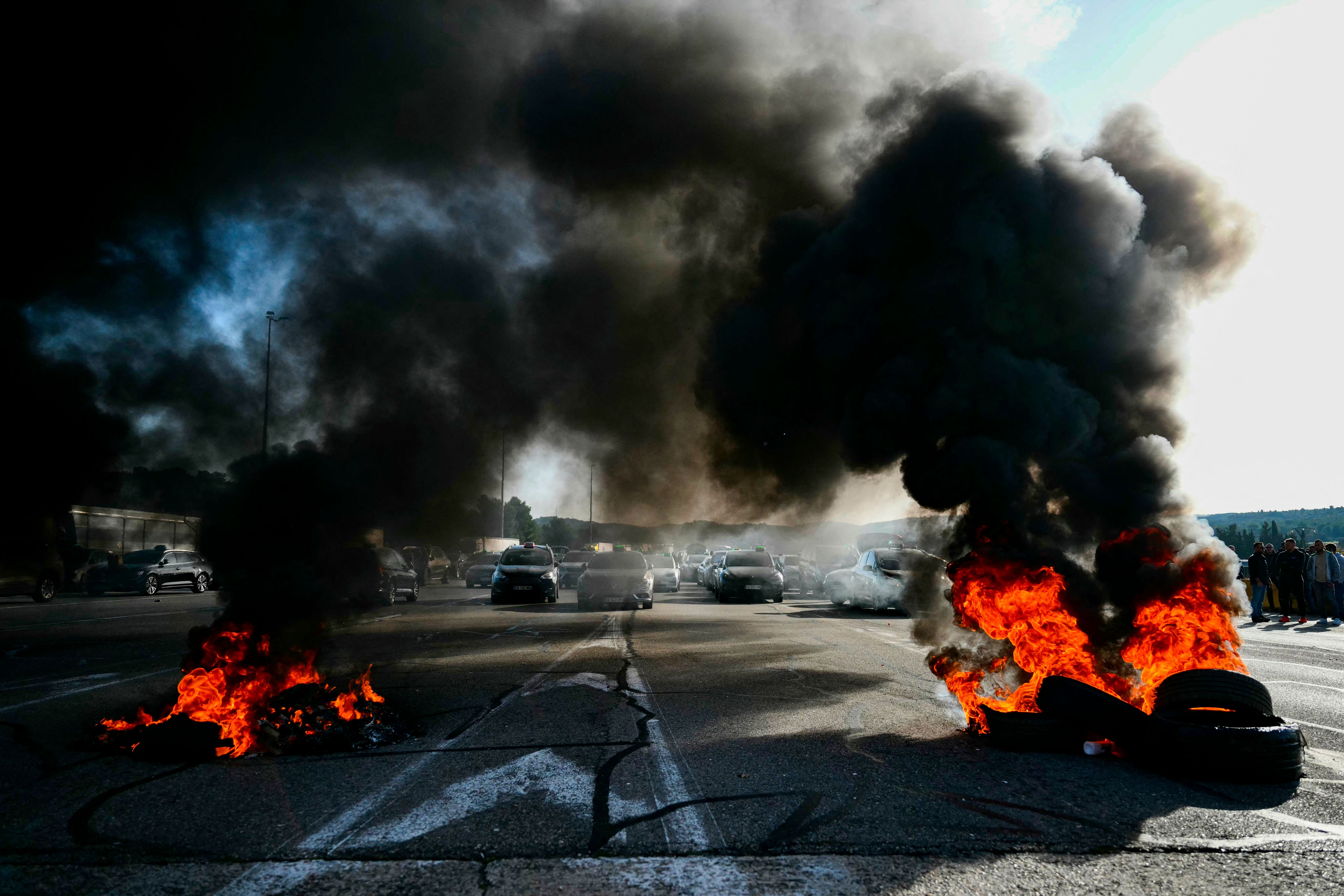 A fire is seen as Taxi drivers block the toll station on the A7 motorway during a demonstration against a new downward pricing system for medical transport and a “shared taxi” obligation proposed by the Caisse Nationale d'Assurance Maladie (CNAM) in Lancon-Provence, southern France, on December 2, 2024. (Photo by Christophe SIMON / Christophe Simon/AFP Photo)