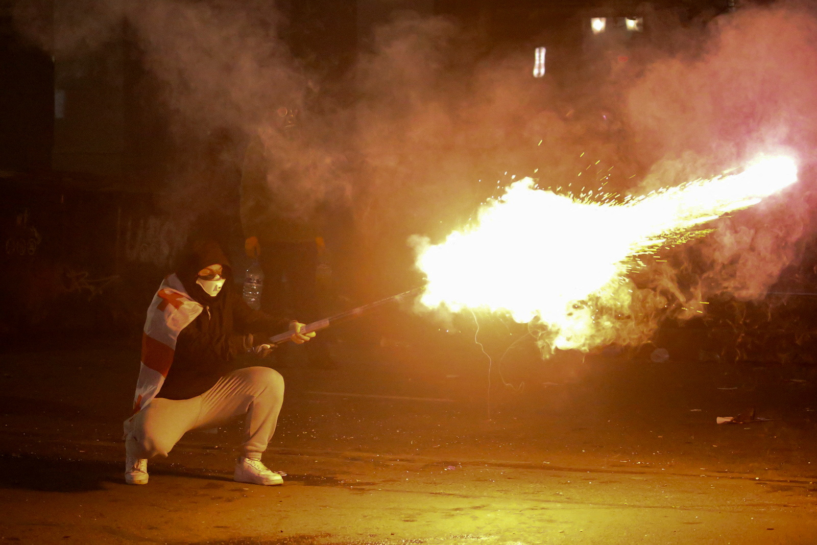 A person wrapped in a Georgian flag attends a demonstration by supporters of Georgia's opposition parties in protest against the government's decision to suspend talks on joining the European Union, in Tbilisi, Georgia on December 4, 2024. (Photo by Irakli Gedenidze/Reuters)