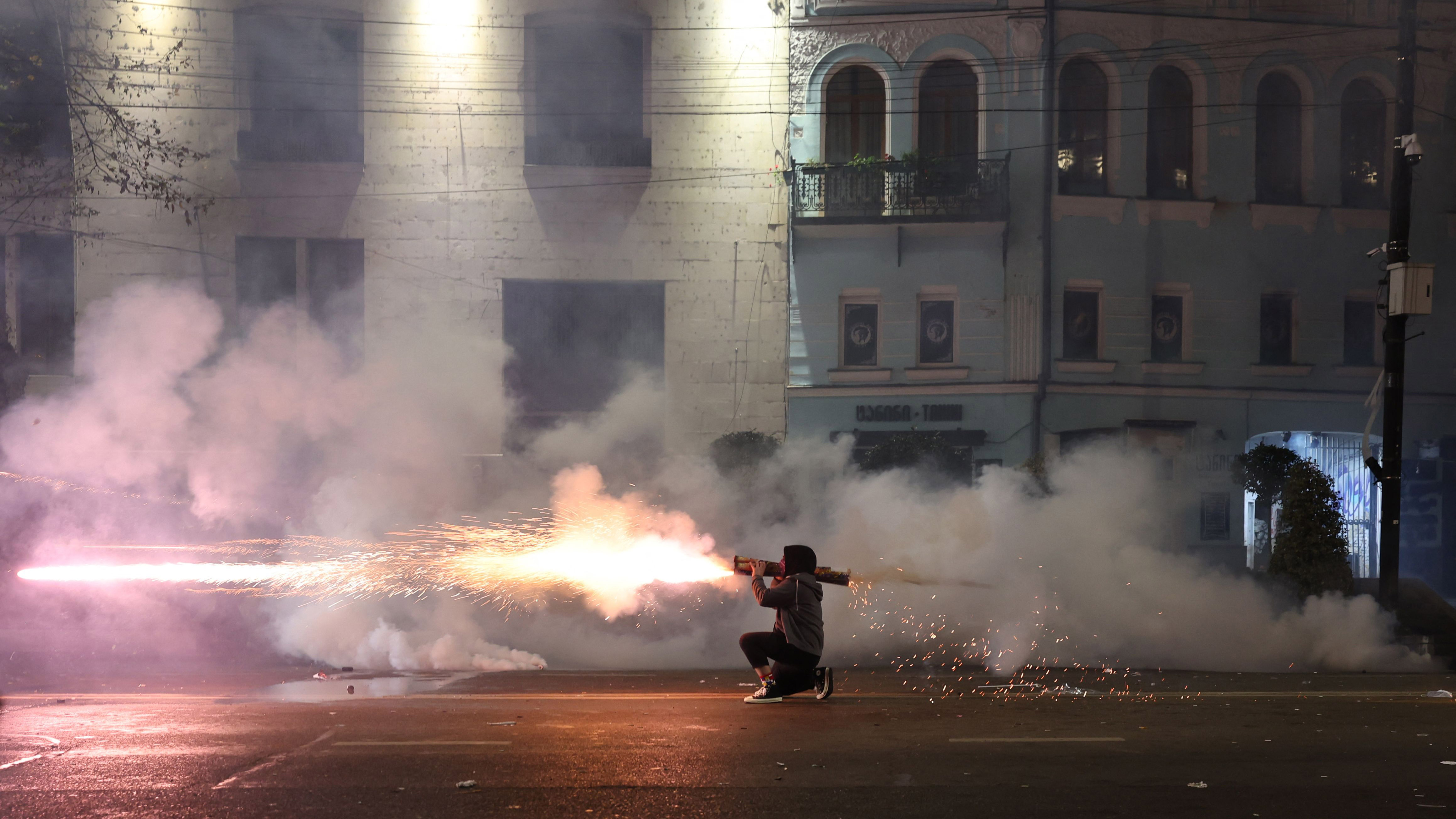 Anti-government protesters launch fireworks towards police during a sixth consecutive day of mass demonstrations against the government's postponement of European Union accession talks until 2028, in central Tbilisi on December 3, 2024. (Photo by Giorgi Arjevanidze/AFP Photo)