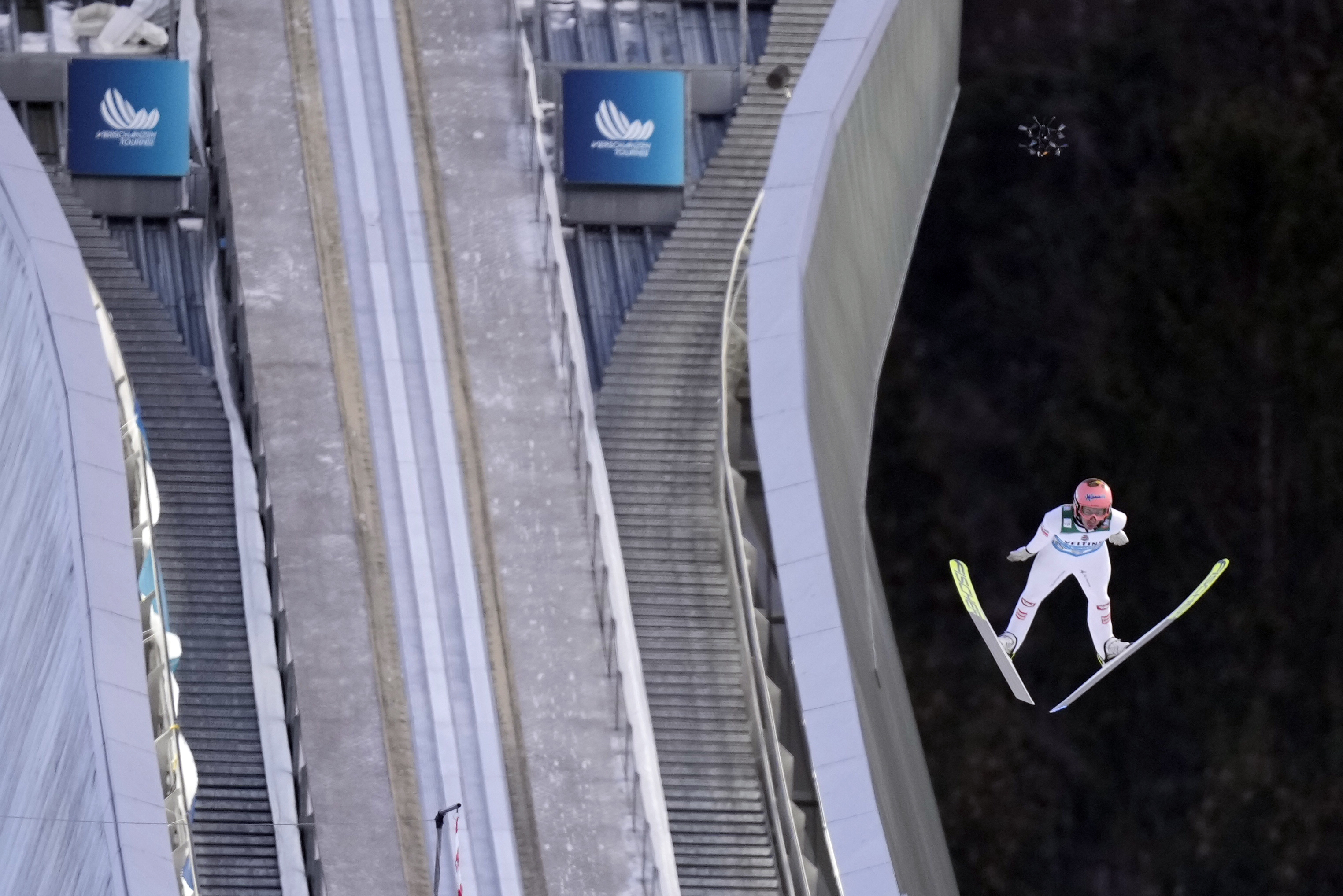 Stefan Kraft, of Austria, soars through the air during his second round jump at the second stage of the 73rd Four Hills ski jumping tournament in Garmisch-Partenkirchen, Germany, Wednesday, January 1, 2025. (Photo by Matthias Schrader/AP Photo)