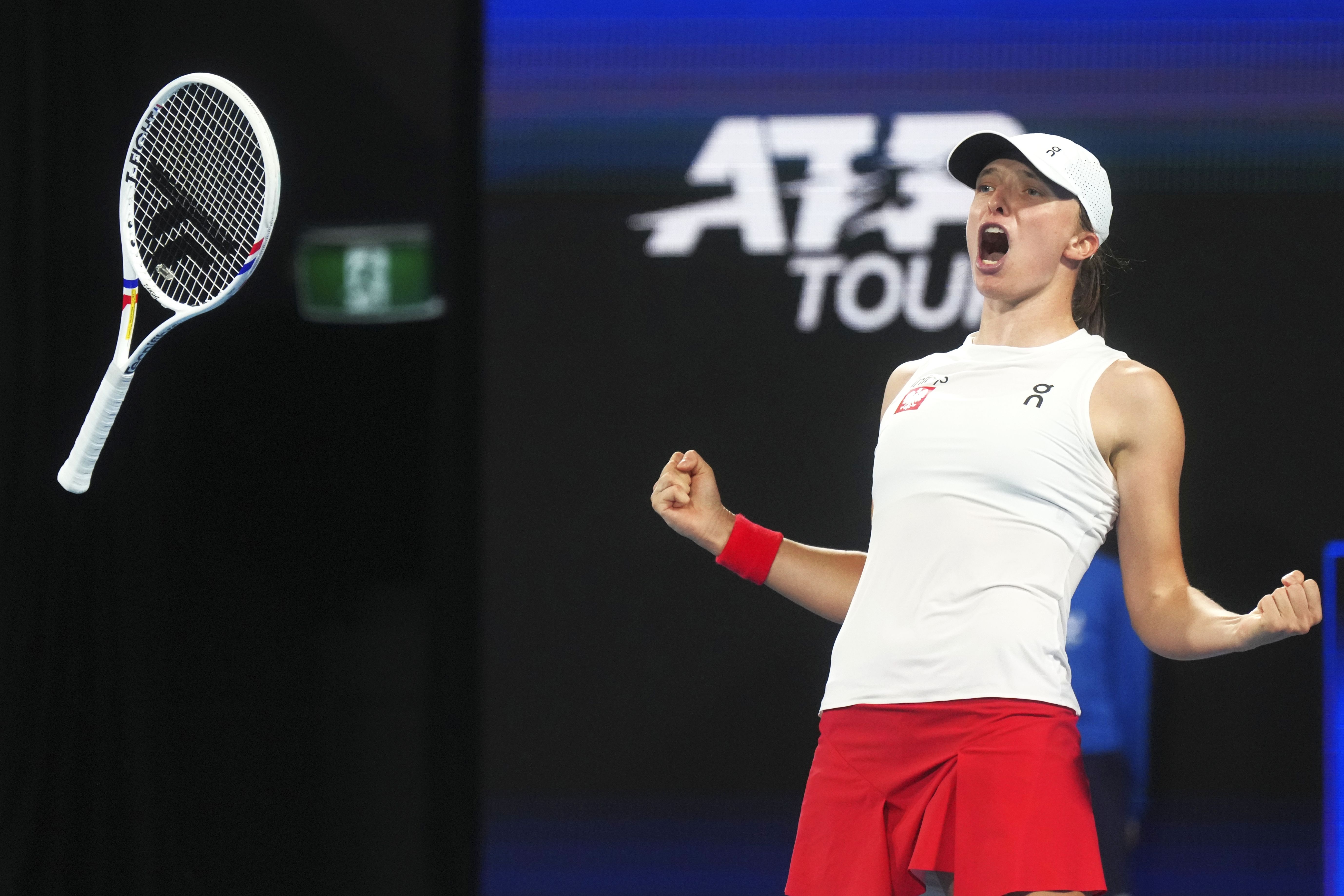 Poland's Iga Swiatek celebrates after defeating Britain's Katie Boulter in their quaterfinal match at the United Cup tennis tournament in Sydney, Australia, Thursday, January 2, 2025. (Photo by Mark Baker/AP Photo)