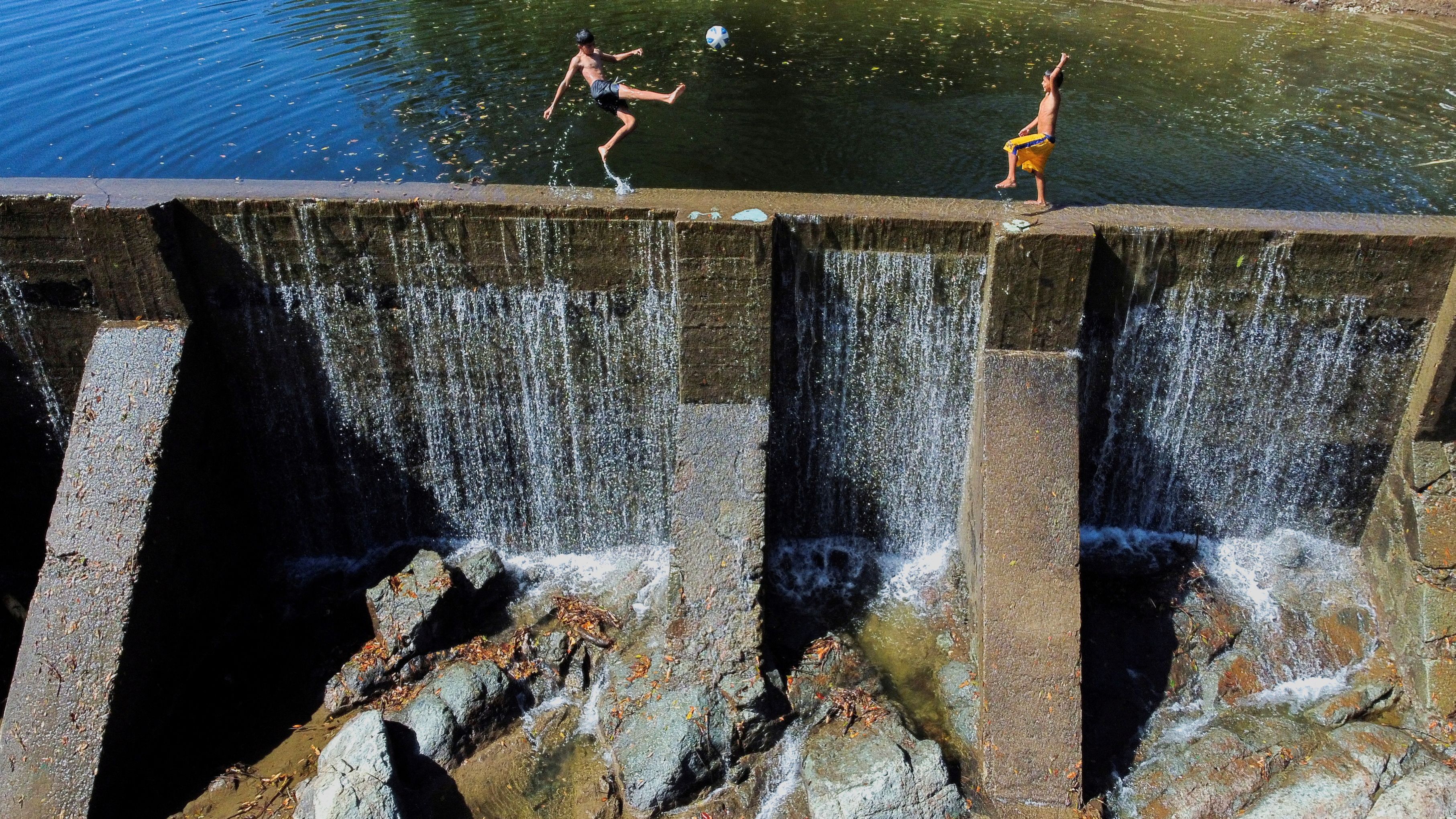 A drone view of children playing on a dam built by a mining company at the San Sebastian gold mine area in Santa Rosa de Lima, El Salvador on December 17, 2024. (Photo by Jose Cabeza/Reuters)