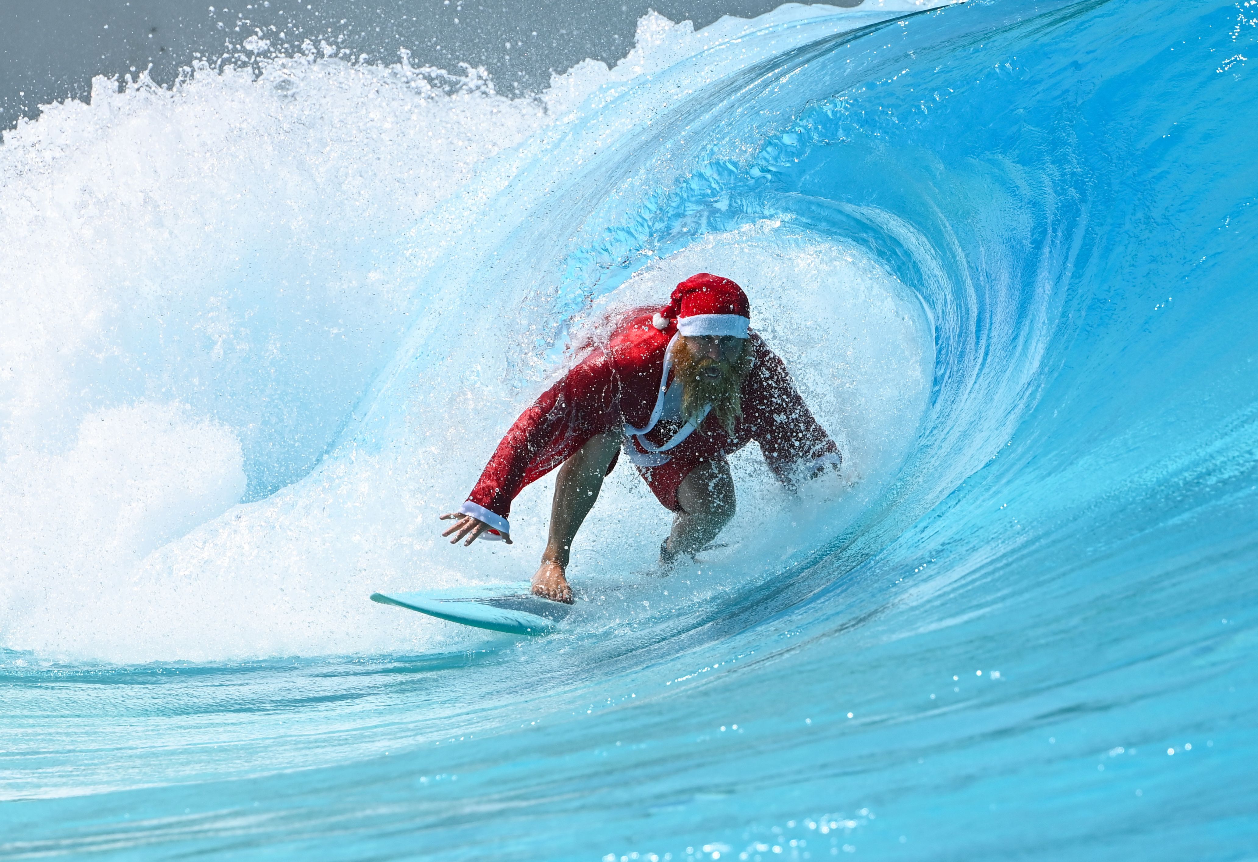 A surfing Santa testing his surf skills before Christmas Day at URBNSURF at Sydney Olympic Park on December 16, 2024 in Sydney, Australia. URBNSURF offers a safe, fun and controlled environment for surfers of all abilities and ages from 6+. From first-timers to seasoned pros, it's the perfect spot to catch some waves, day and night, and create unforgettable memories with family and friends. URBNSURF is the only company in the world with two owned and operating surf parks. (Photo by James D. Morgan/Getty Images for URBNSURF)