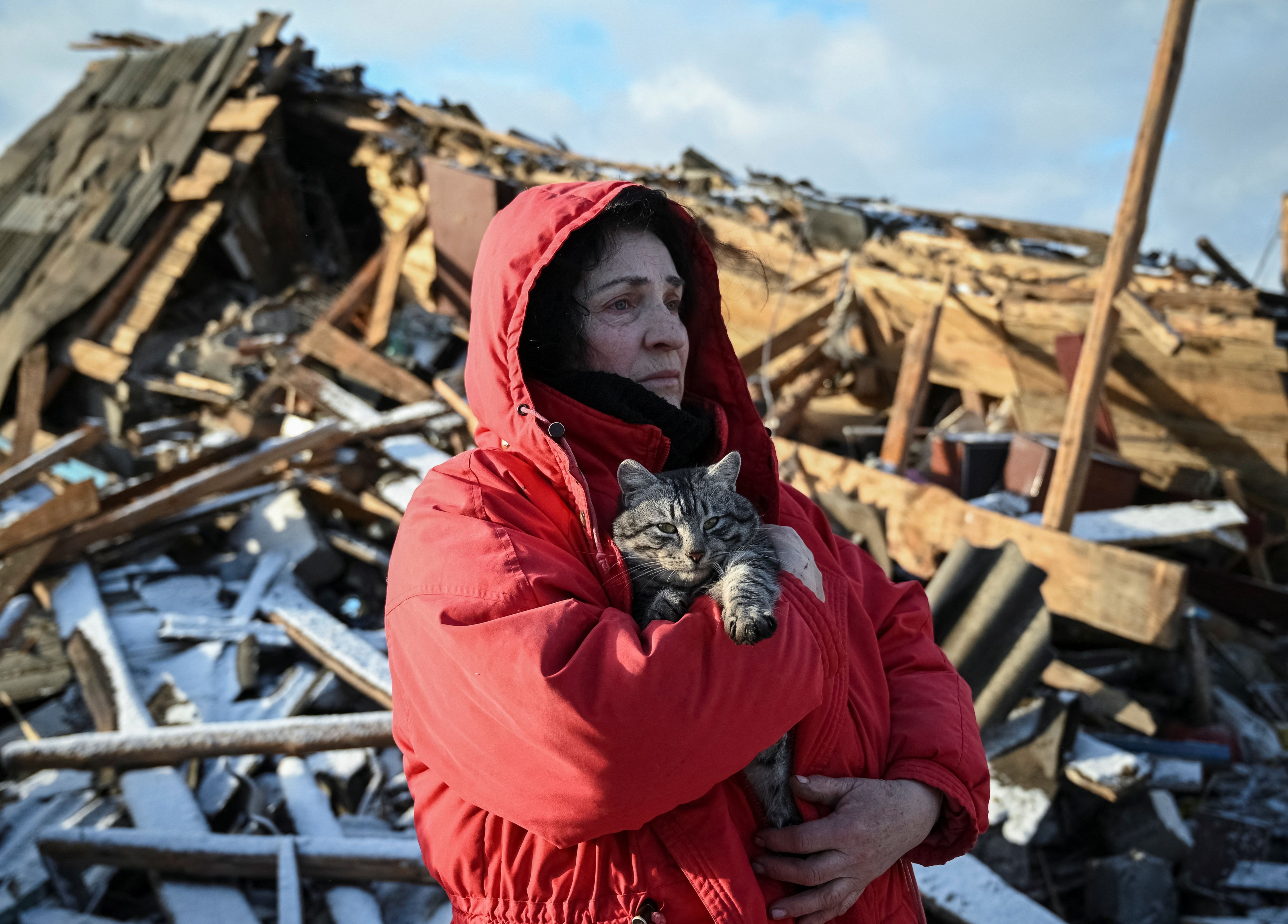 Resident Svitlana Vlasyk hugs her cat and looks at her house destroyed by yesterday's Russian missile strike, amid Russia's attack on Ukraine, in Chernihiv, Ukraine on January 4, 2025. (Photo by Maksym Kishka/Reuters)