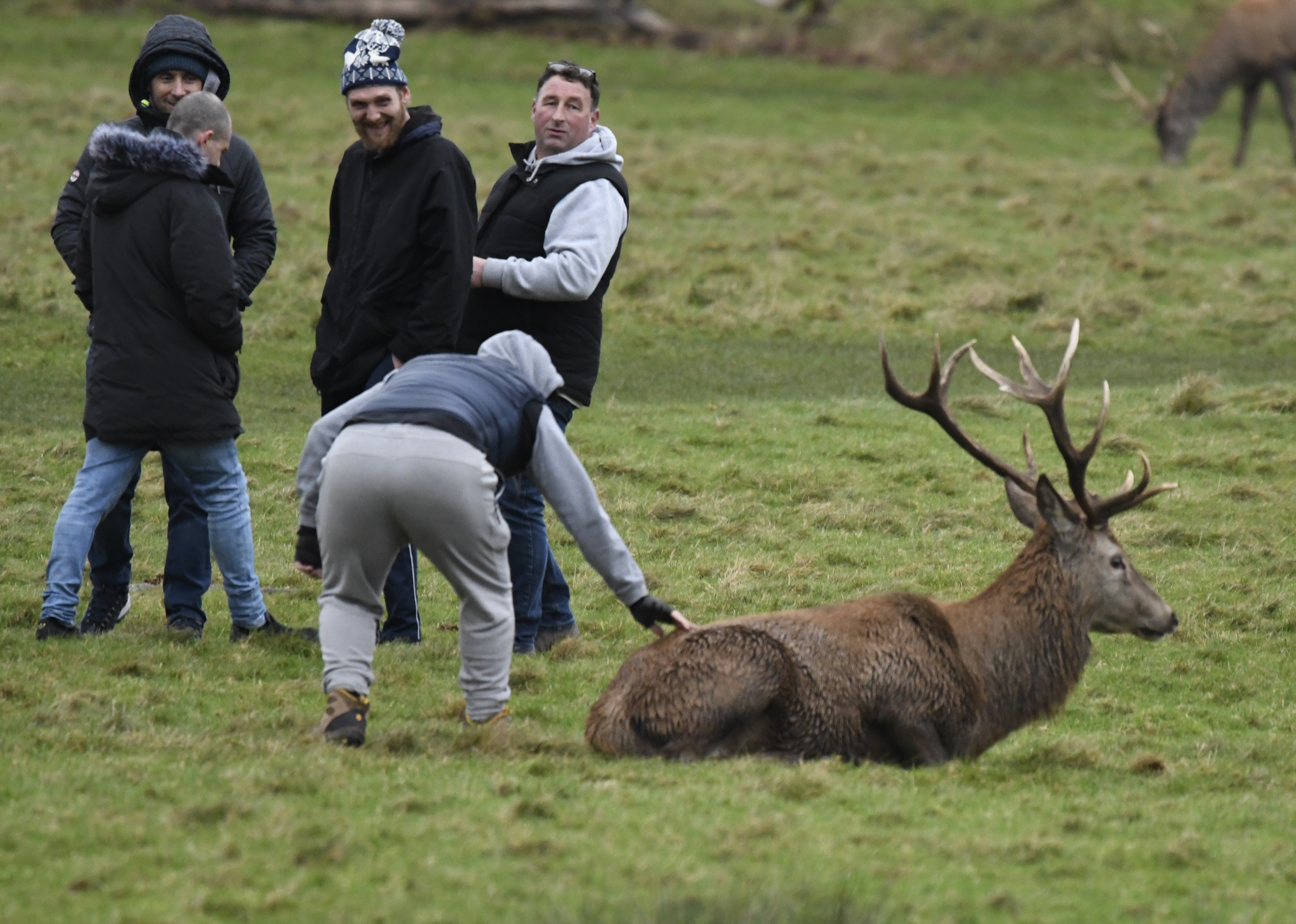This is the shocking moment three degenerates assault a wild stag during a cruel display in a city park. The trio of young men, wearing hoodies, gilets and tracksuit bottoms, took turns to pull the male deer's antlers and slap it on the romp. The unsavoury scenes took place in Wollaton Park, Nottingham, UK on January 4, 2025, where increasing numbers of “deer pestering” incidents have been reported. The men were photographed in the act by wildlife photographer Chris Golightly, who was horrified at what she witnessed. (Photo by Chris Golightly/Bournemouth News)