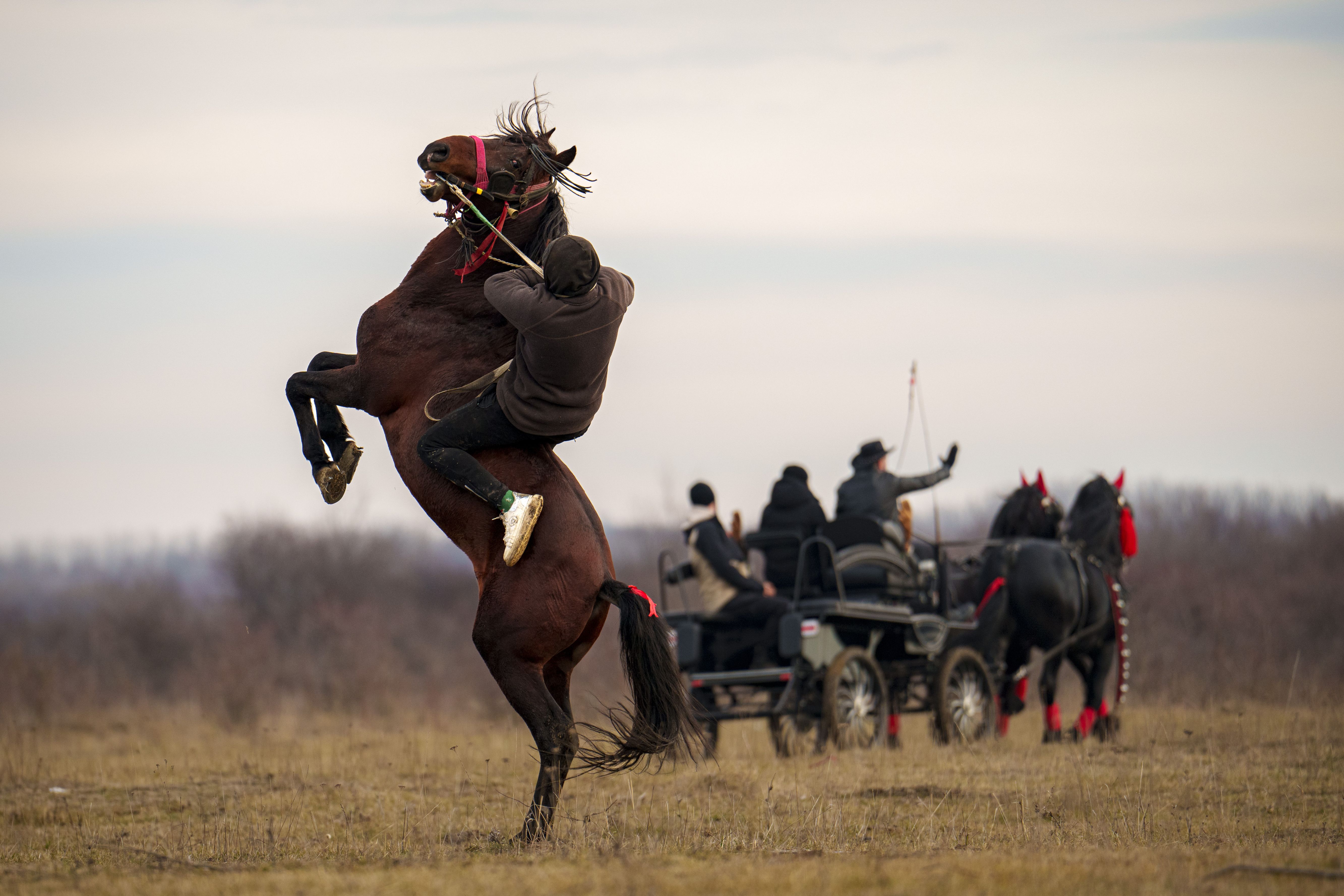 A man struggles not to fall off a horse before competing in a traditional horse race during Epiphany celebrations in the village of Pietrosani, Romania, Monday, January 6, 2025. (Photo by Vadim Ghirda/AP Photo)