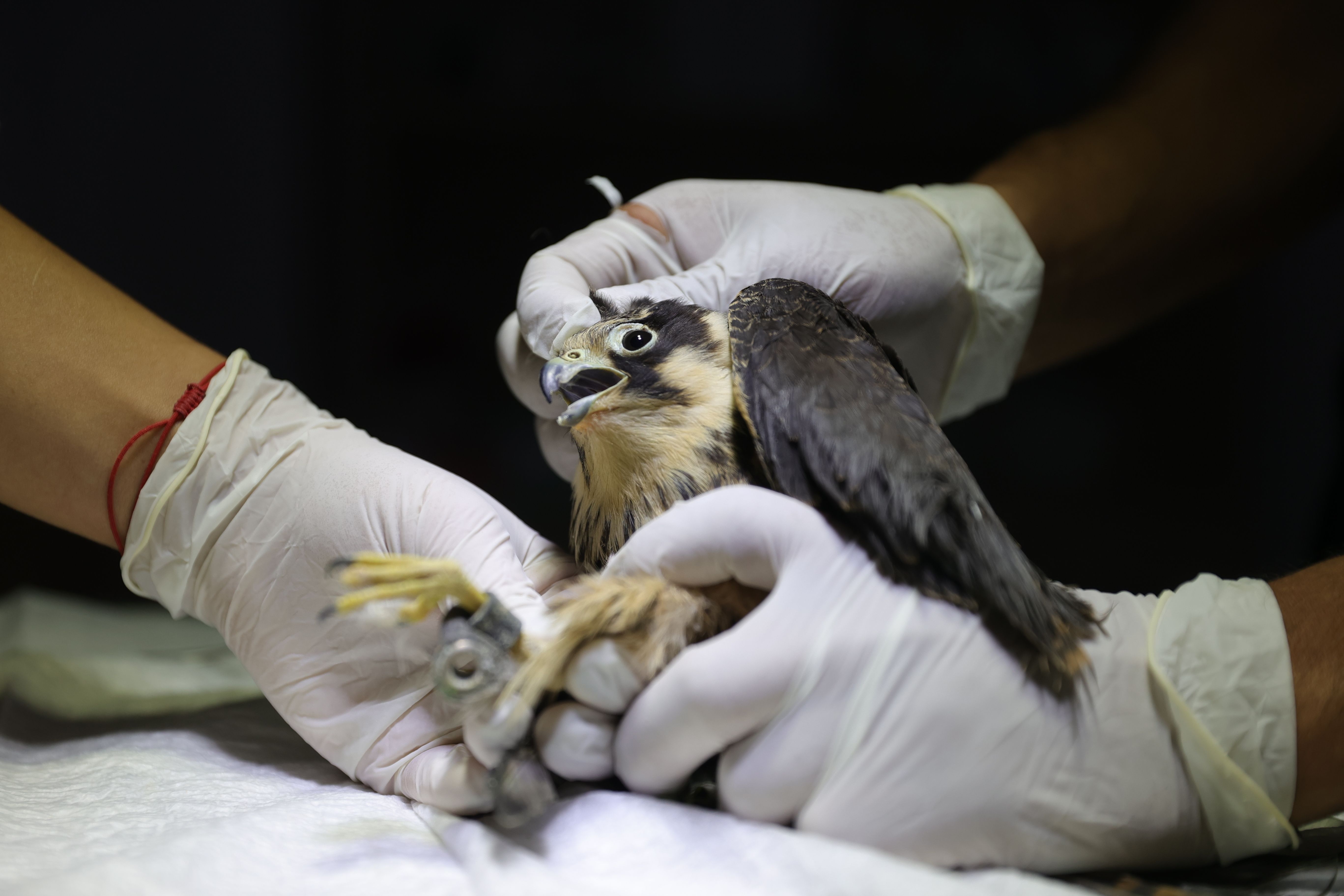 A falcon cub, which is being treated in Antalya Natural Life Park, is pictured on December 19, 2024 in Antalya, Turkiye. The falcon found in a box at the intercity bus terminal in Antalya will be released to its natural habitat after the treatment process in Antalya Wildlife Park. (Photo by Suleyman Elcin/Anadolu via Getty Images)