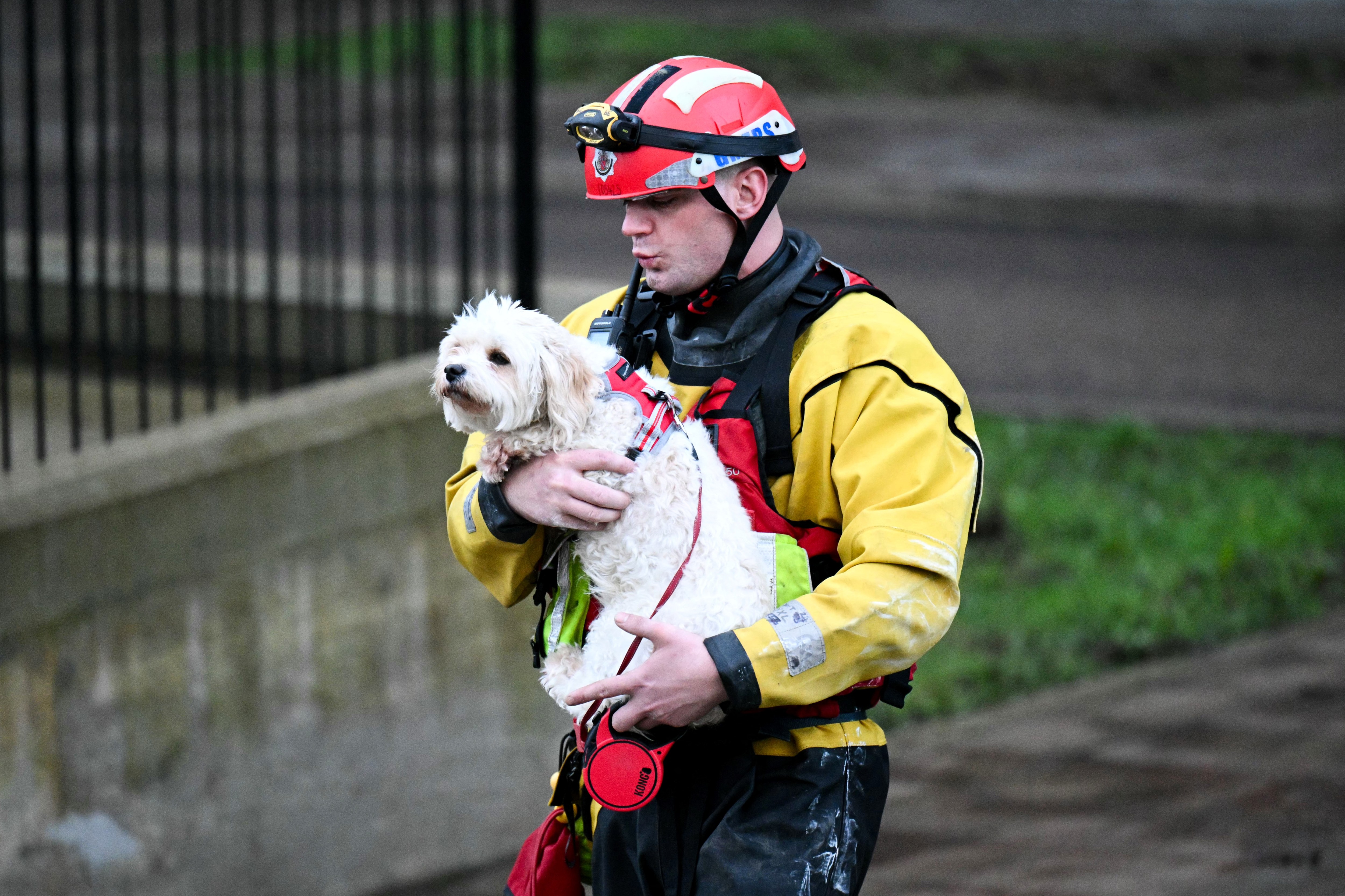 A firefighter carries a dog after evacuating a flooded building in Manchester, northern England, January 1, 2025 as weather warnings were put in place for rain, snow and wind across the UK. Adverse weather is set to hit UK New Year festivities, as the organisers of Edinburgh's Hogmanay street party cancelling the event on public safety grounds. (Photo by Oli Scarff/AFP Photo)