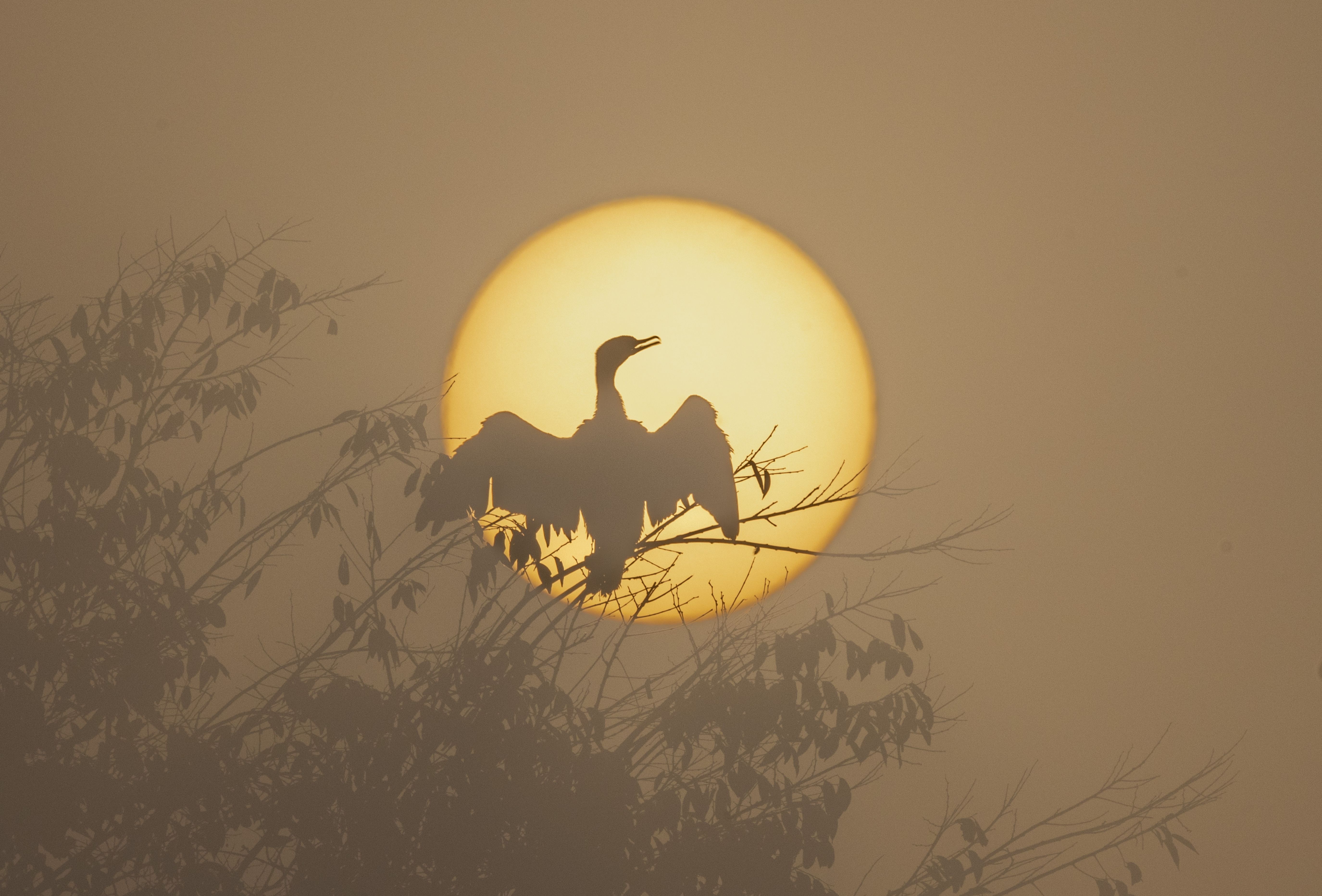 The sun rises amid winter clouds as a Great Cormorant migratory bird perches on tree branches at Tauddaha Lake in Kathmandu, Nepal, 01 January 2025. )Photo by Narendra Shrestha/EPA)