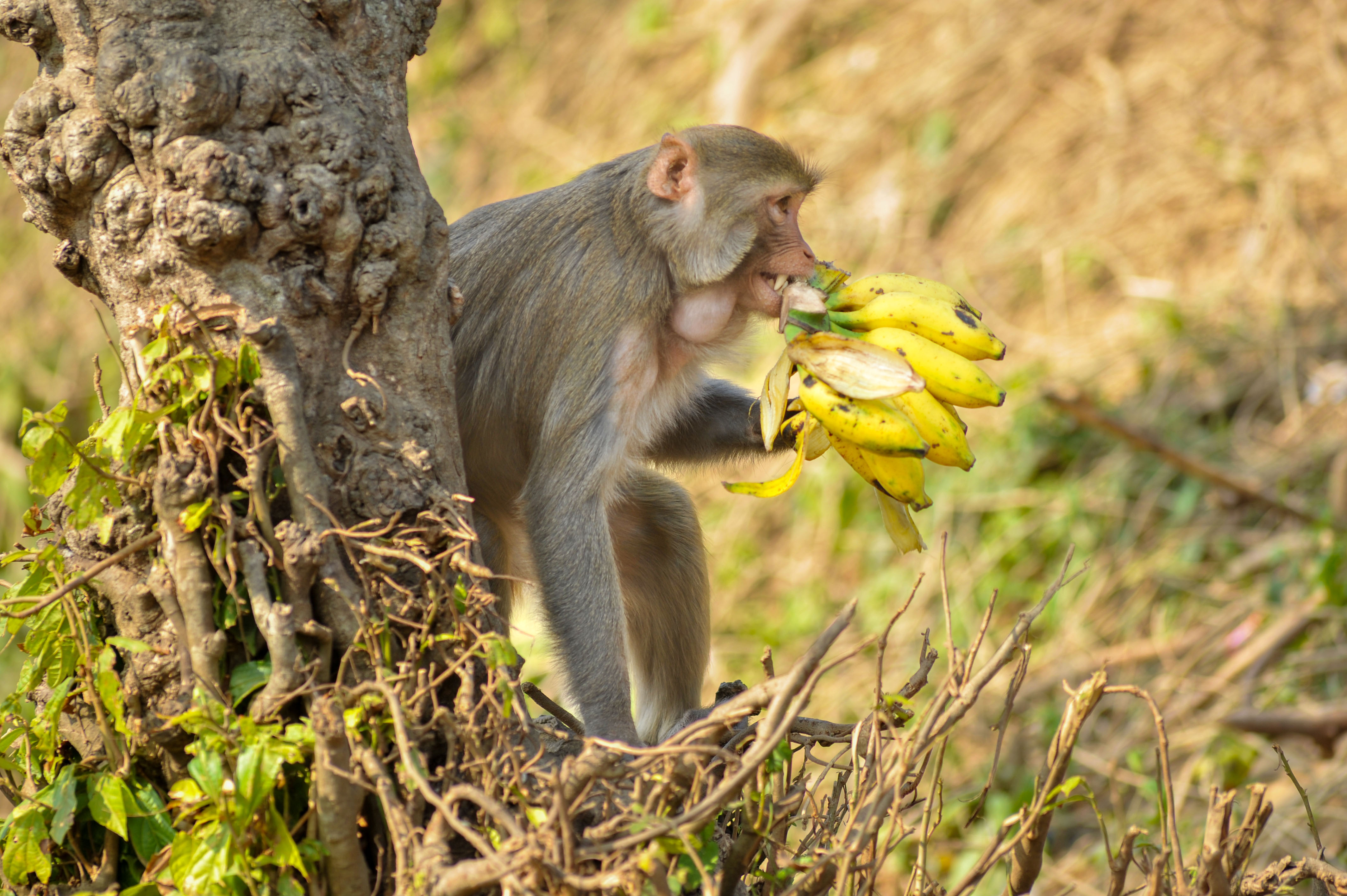 A rhesus macaque monkey eats a banana at the shrine of Hazrat Chasni Pir in Sylhet, Bangladesh on December 29, 2024. Chasni Pir was a geologist who had a pet monkey. When he died, his tomb became famous for its monkeys, supported by visitors who believed that if the monkeys accepted their offerings of food, their wishes would come true. (Photo by Md Rafayat Haque Khan/ZUMA Press Wire/Rex Features/Shutterstock)